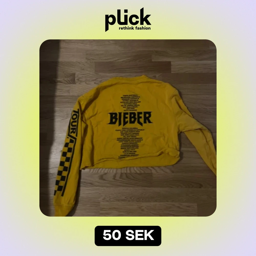 En gul långärmad tröja från Team Bieber med texten 'BIEBER' och turnédatum tryckt på baksidan. Framsidan har texten 'TOUR' och ett schackrutemönster. Ärmarna har också texten 'TOUR' och schackrutemönster. Vid köpa av flera varor sänks priset 🌟🌸