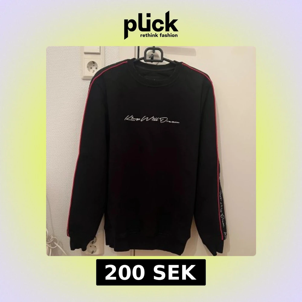 Svart sweatshirt från Kings Will Dream i storlek XS. Tröjan har röda ränder längs ärmarna och vita logotryck på bröstet och längs ärmarna. Perfekt för en streetwear-look.