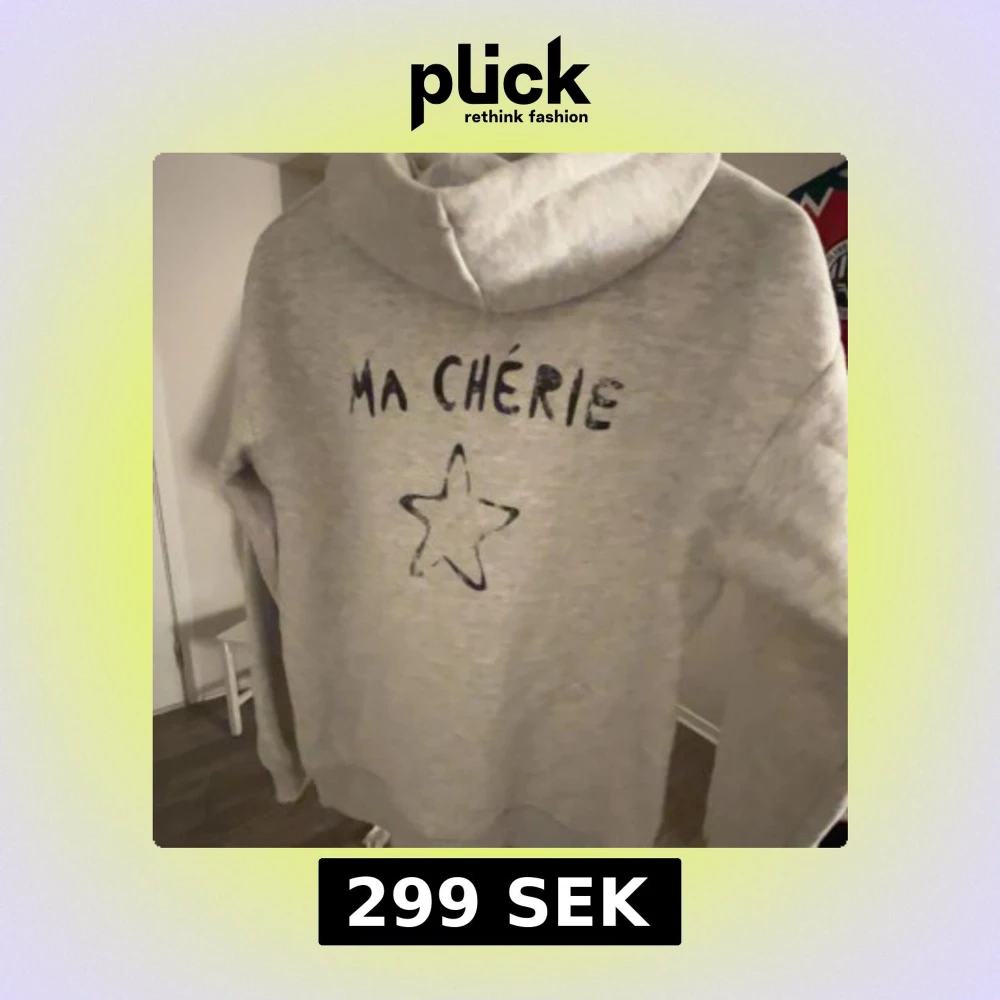 Säljer en grå hoodie med texten 'MA CHÉRIE' och en stjärna tryckt på både fram- och baksidan. Tröjan har en klassisk huva och långa ärmar, perfekt för en avslappnad stil