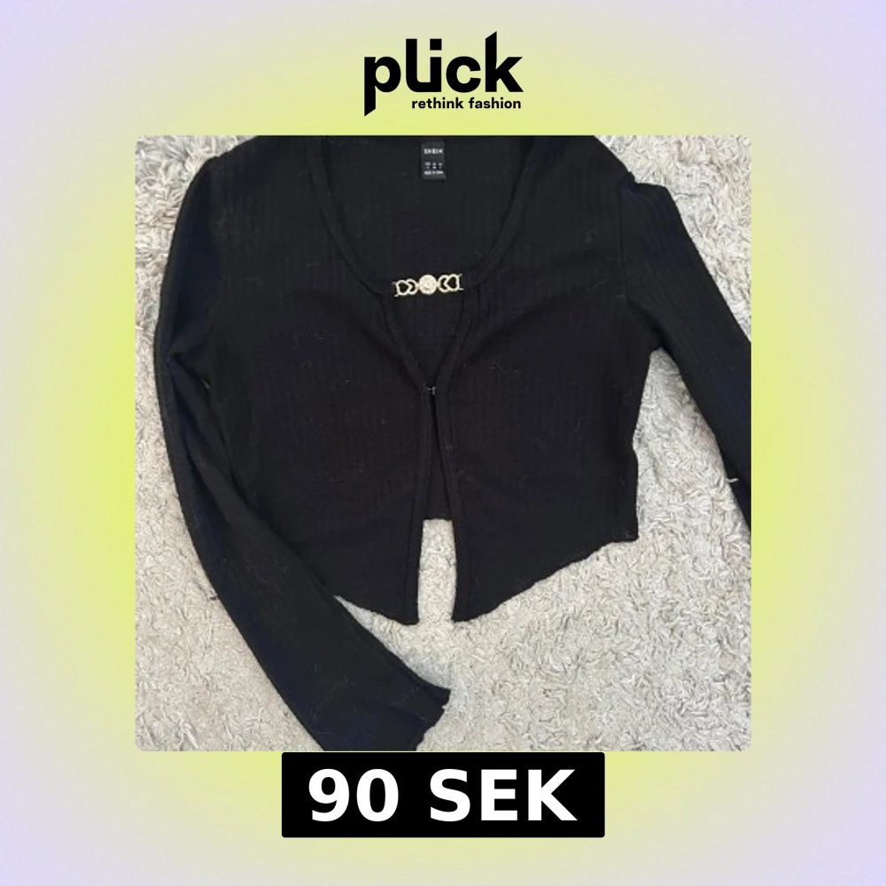 Säljer en svart ribbad fest tröja från Shein med en dekorativ guldfärgad detalj framtill. Koftan är croppad och har långa, utsvängda ärmar. Perfekt för fest! 😍