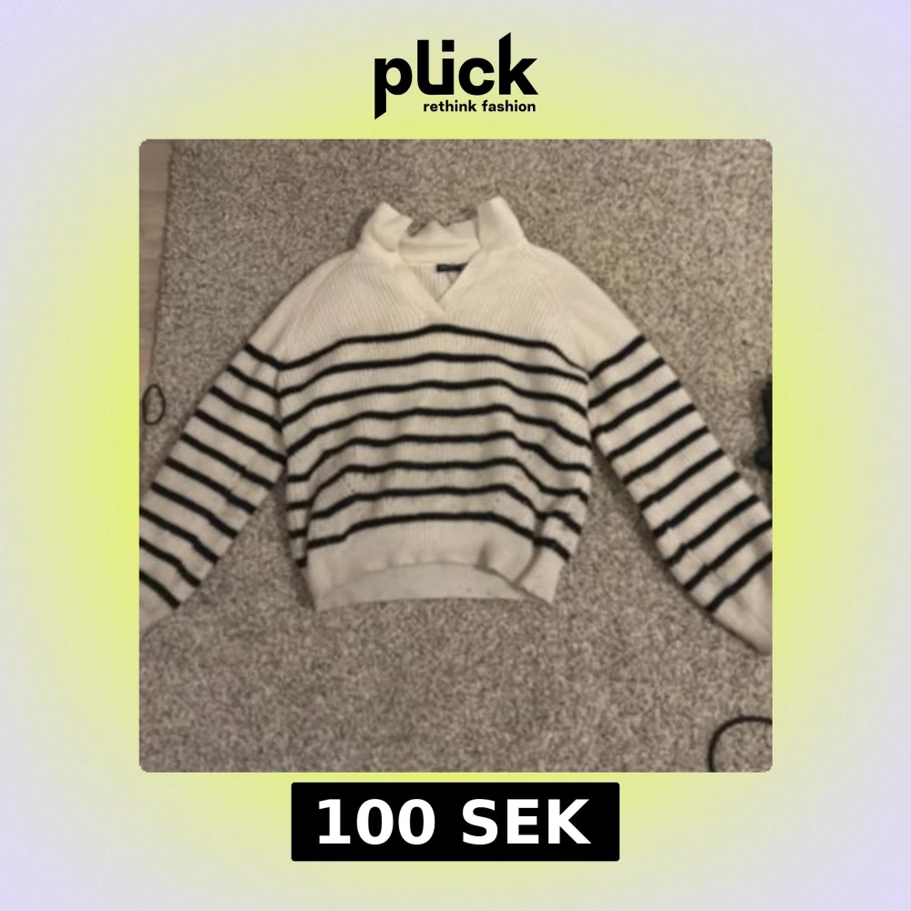 Säljer en snygg vit tröja med svarta ränder. Tröjan har en v-ringad krage och långa ärmar. Perfekt för en stilren look.