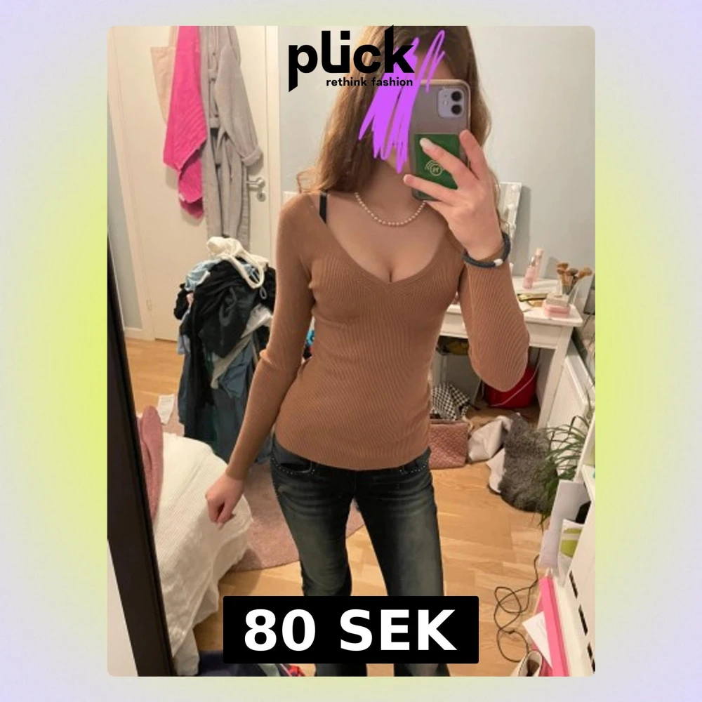 Säljer en ribbad brun långärmad tröja med djup v-ringning. Tröjan har en tight passform och är perfekt för dig som gillar en enkel men snygg stil. Materialet är stretchigt och sitter skönt på kroppen.