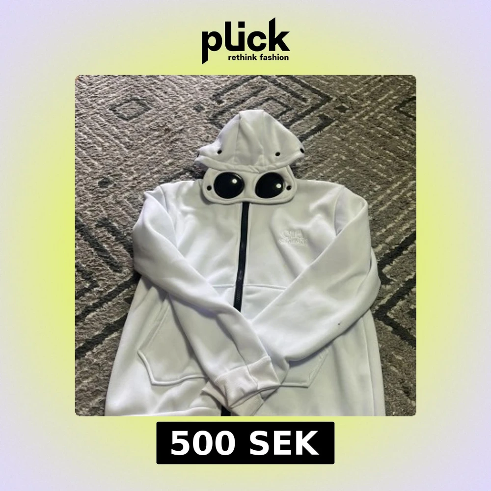 Säljer en vit hoodie från C.P. Company med unika glasögon i huvan och dragkedja framtill. Tröjan har broderad logga på bröstet och ribbade muddar vid ärmslut och nederkant. Perfekt för dig som vill sticka ut!