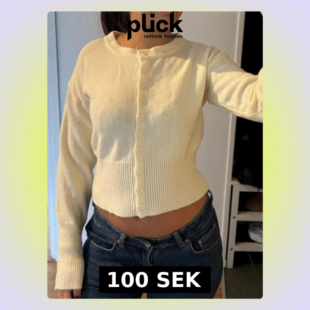 Snygg krämvit cropped kofta med långa ärmar och ribbad midja. Koftan har rund halsringning och knäpps med matchande knappar framtill. Perfekt att styla med jeans eller kjol för en trendig look.