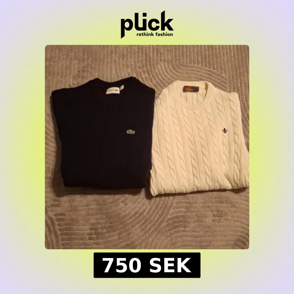 Två snygga stickade tröjor, en svart från Lacoste med deras ikoniska logga och en vit från Gant med ett diskret emblem. Perfekta för kyligare dagar och ger en stilren look.