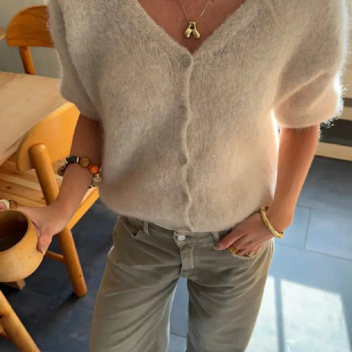 Supermjuk och fluffig beige kofta med v-ringning och knappar framtill. Koftan har kortare ärmar och en avslappnad passform, perfekt för lager på lager. Den stickade känslan ger en mysig vibe och passar till både jeans och kjol.