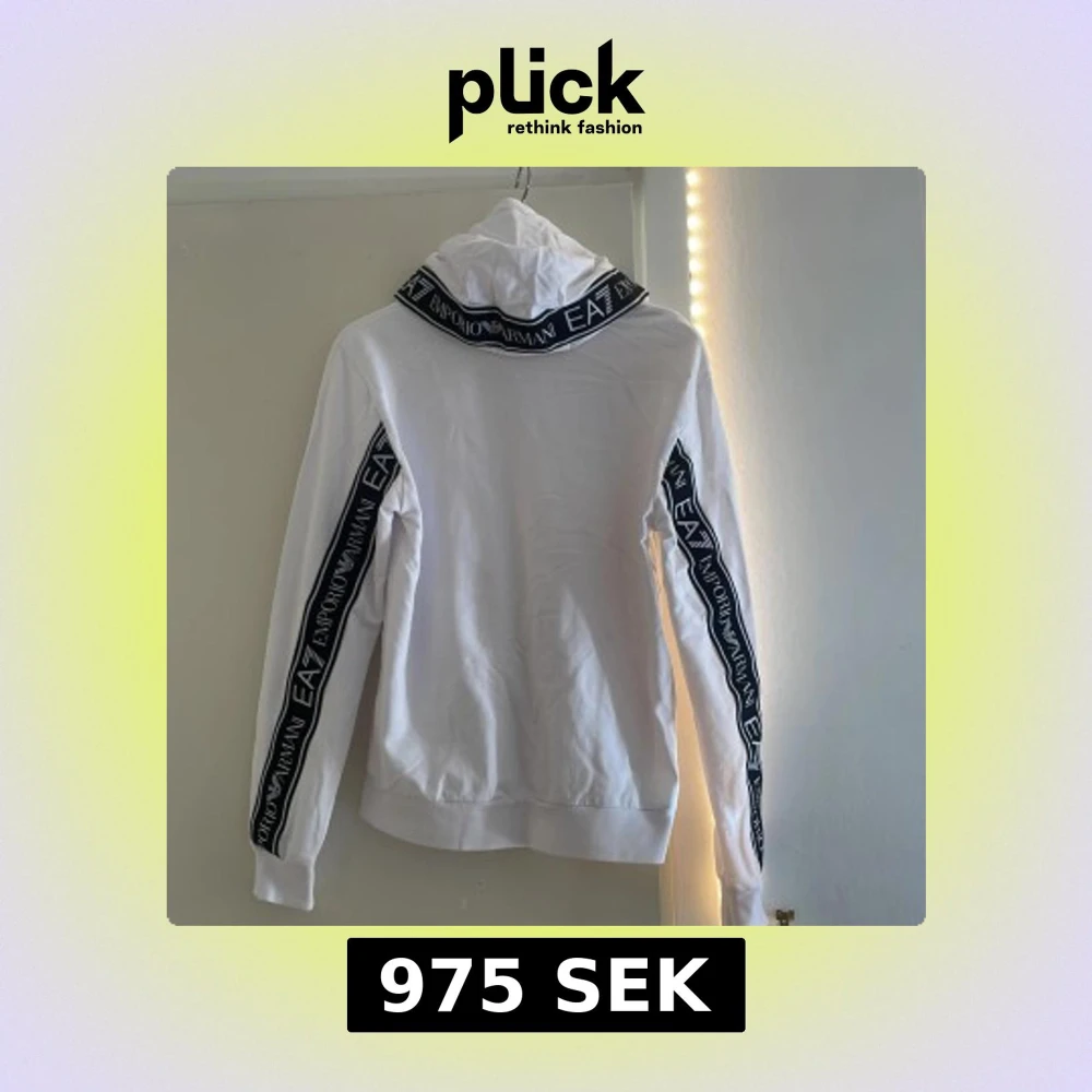Säljer en vit ea7/ Armani hoodie som jag fick på julen men har tyvärr inte kommit till andväning, hoddien är helt oanvänd samt inga fläckar eller skador. Ord priset på hoodien är 1722kr. Hoodien har text ränder på armarna och huvan och är en stretchig hoodie. Passar bra nu när de börjar bli lite kallare ute.