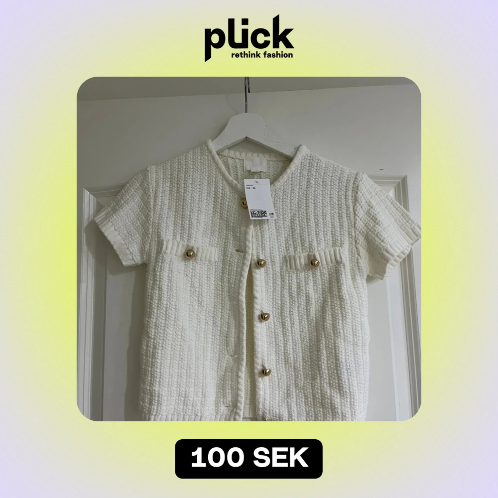 Säljer en superfin vit kofta med korta ärmar och snygga guldfärgade knappar. Den har en texturerad yta och två dekorativa fickor fram. Perfekt för vår och sommar, och kan lätt stylas upp eller ner beroende på tillfälle. Passar både till jeans och kjol!