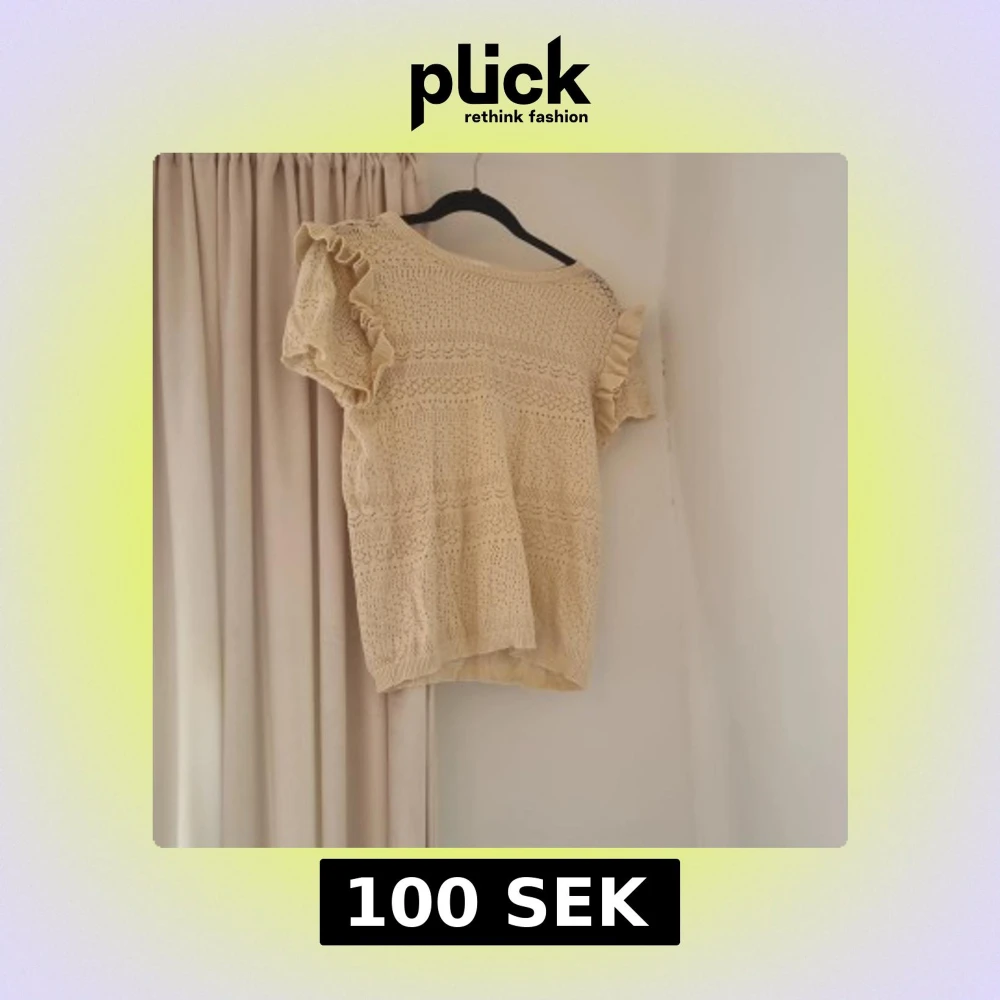 Supersöt beige stickad blus från Stories i storlek XS. Blusen har korta ärmar med volangdetaljer och ett vackert hålmönster över hela plagget. Perfekt för vår och sommar när du vill ha en romantisk och luftig look.