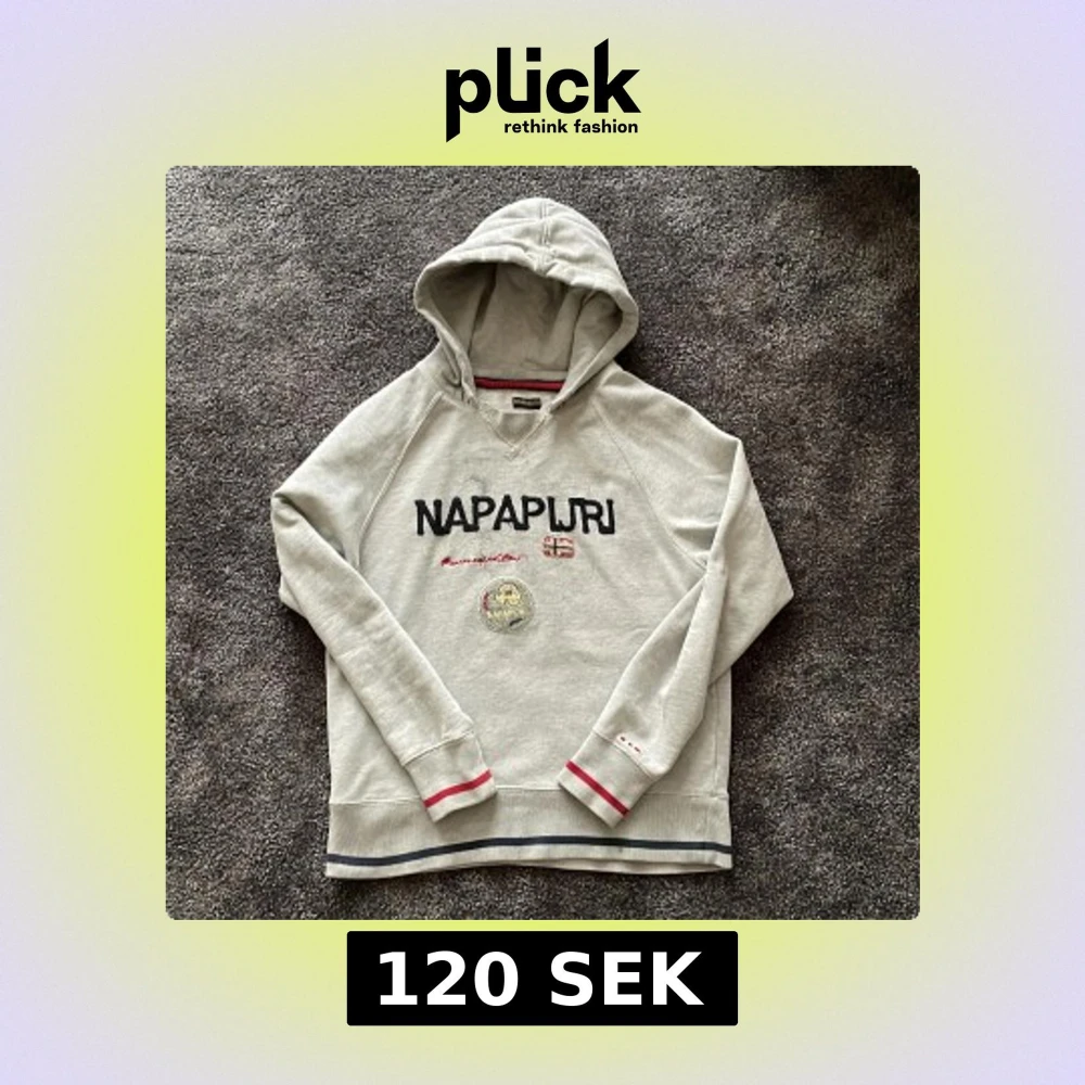 Grå hoodie från Napapijri med broderad logga, patch och norska flaggan framtill. Muddar med röda detaljer och huva. Skön passform och klassisk streetstil, perfekt för dig som gillar en avslappnad stil. En liten svart prick på ryggen jag inte lyckats få bort tyvärr men går säkert att få bort på något sätt.