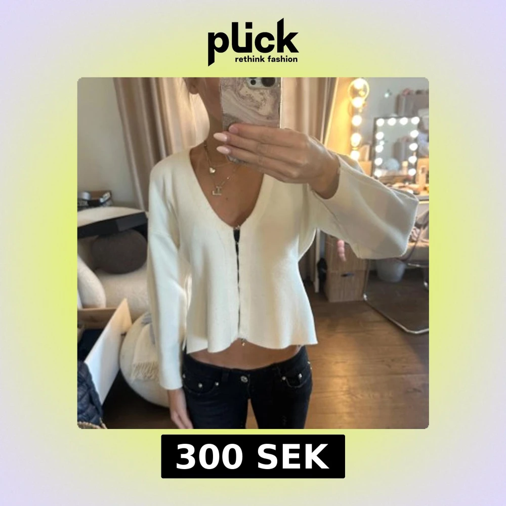 Säljer en vit v-ringad kofta med lång ärm och lätt croppad passform. Koftan har en enkel design utan synliga knappar eller dragkedja framtill och är tillverkad i ett mjukt material. Perfekt för lager-på-lager och stilrena outfits.
