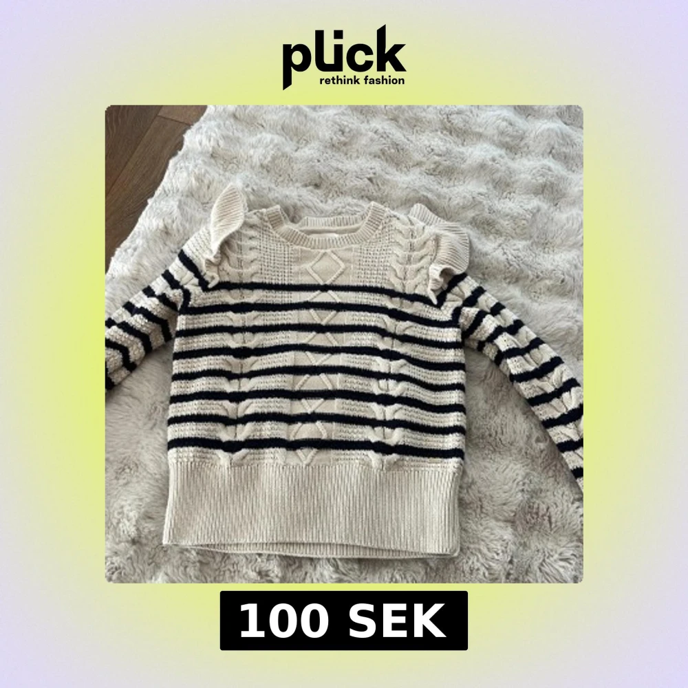 Supersöt stickad tröja från Holly & Whyte i beige och marinblått med kabelstickade detaljer, volang på axlarna och rund hals. Tröjan har lång ärm och ett klassiskt randigt mönster som ger en preppy vibe.