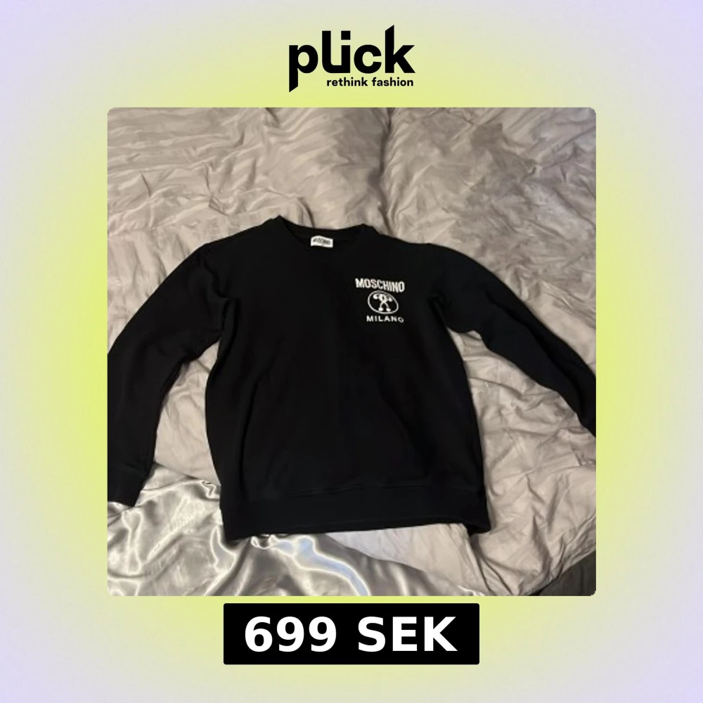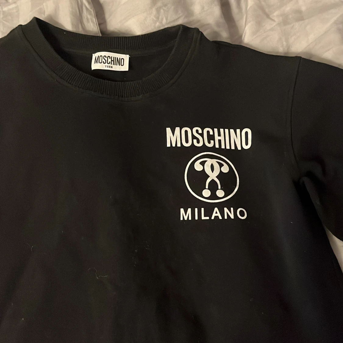 Säljer en stilren svart sweatshirt från Moschino med vit logotyp på bröstet. Tröjan har en klassisk rund hals och långa ärmar. Perfekt för en avslappnad och trendig look. Nypris 2200 kr