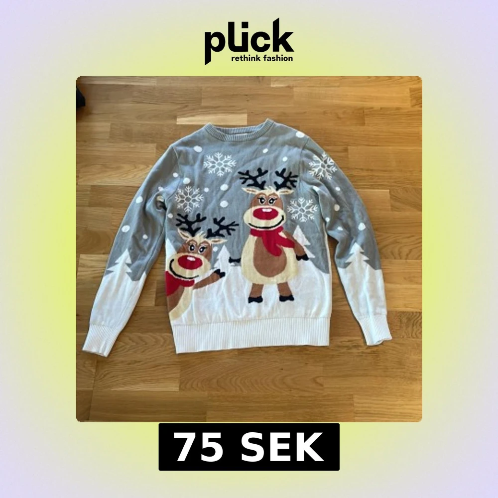 Säljer en grå jultröja med ett gulligt renmotiv och snöflingor. Tröjan har långa ärmar och ribbstickade muddar. Perfekt för julfirandet! 🎄