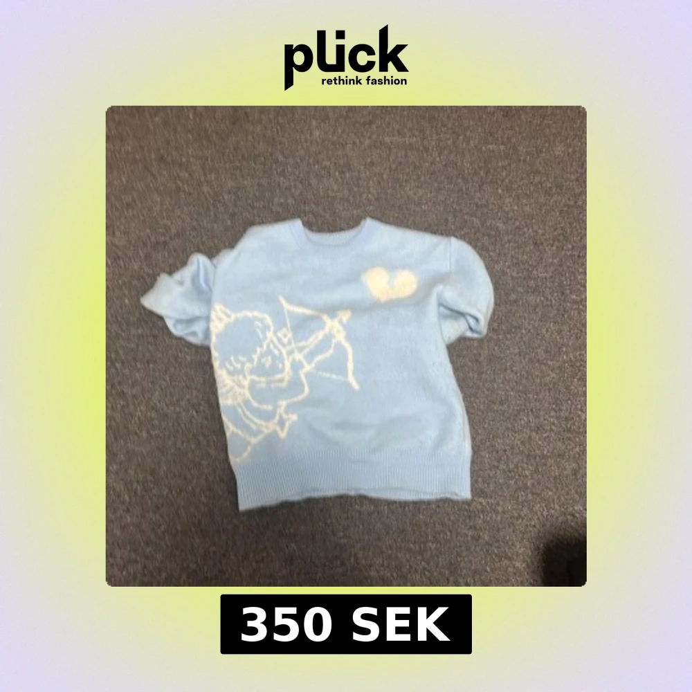 Säljer en ljusblå stickad tröja med ett unikt ängelmotiv och texten 'I WOULD RATHER NOT LOVE' på baksidan. Tröjan har långa ärmar och ribbade kanter. Perfekt för en avslappnad stil.