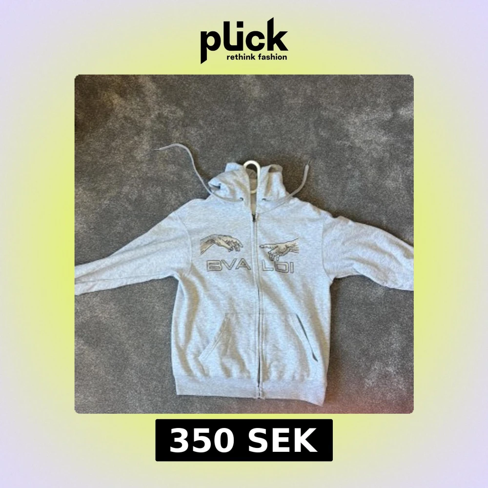 Säljer en ljusgrå hoodie med dragkedja från BVALDI. Tröjan har tryck med två händer och text på bröstet, huva med dragsko och två fickor framtill. Perfekt för en avslappnad stil.