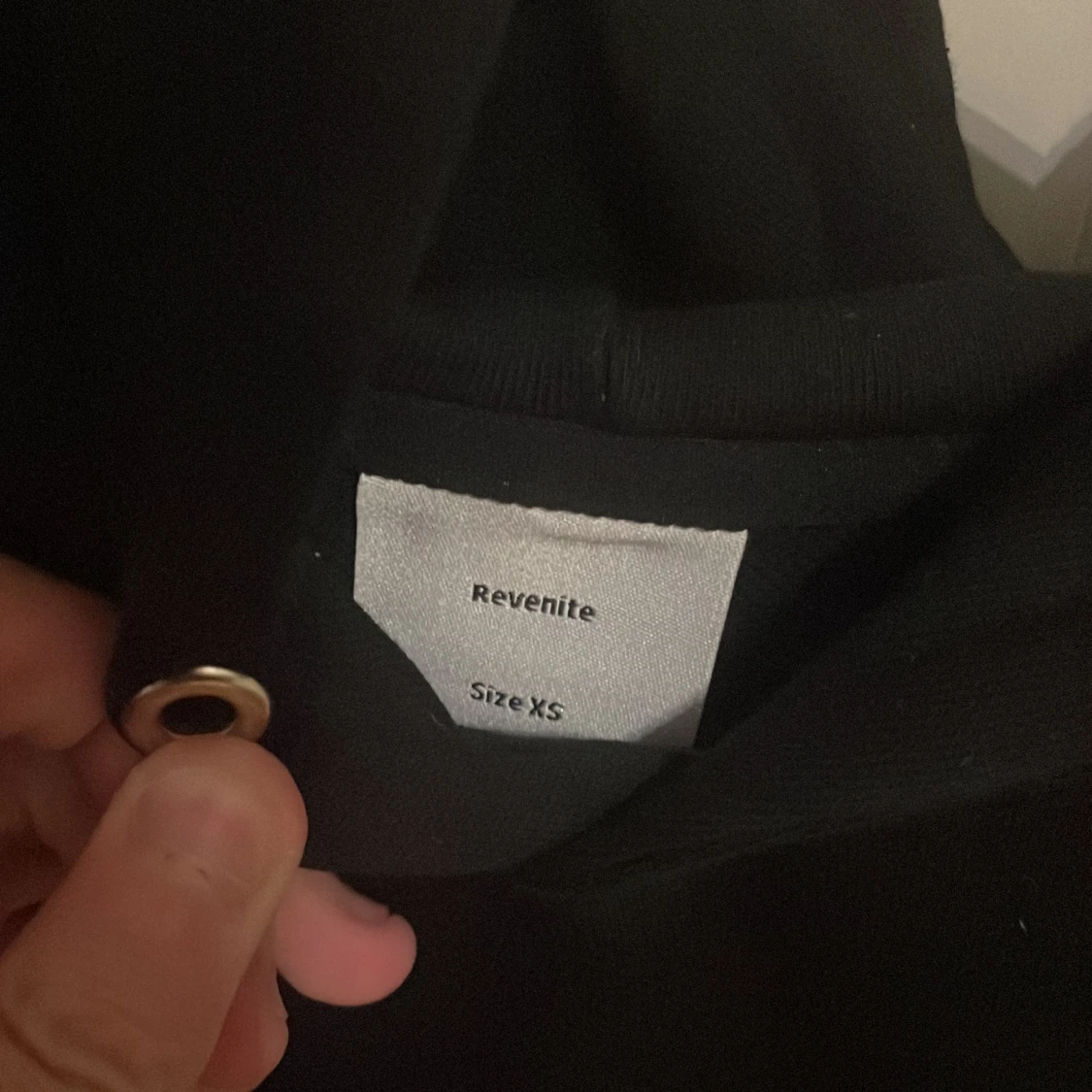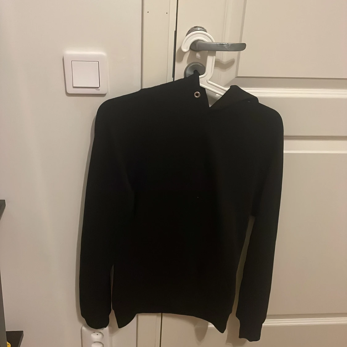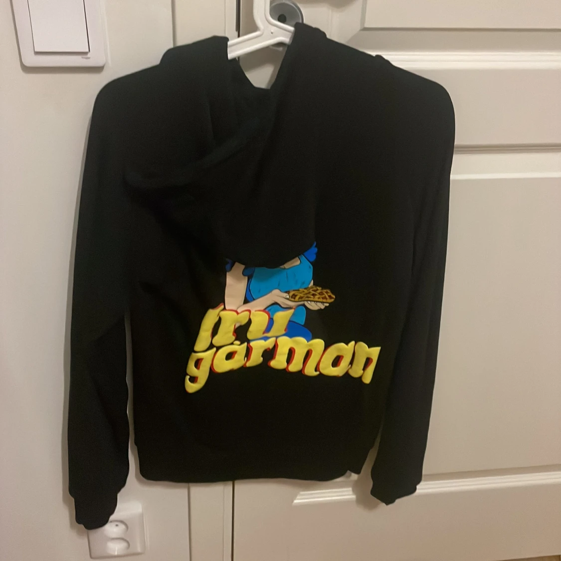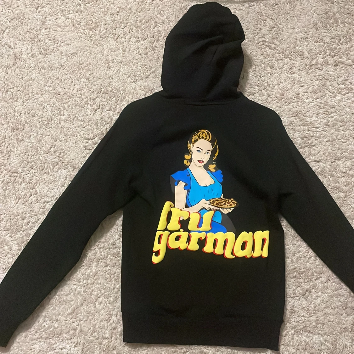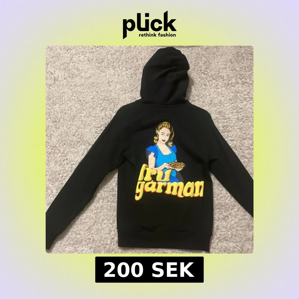 Svart hoodie från Revenite i storlek XS med stor färgglad print på ryggen av en kvinna i blå klänning och texten 'fru garman' i gul 3D-stil. Klassisk huva och långa ärmar, perfekt för dig som gillar unika tryck och streetstyle.