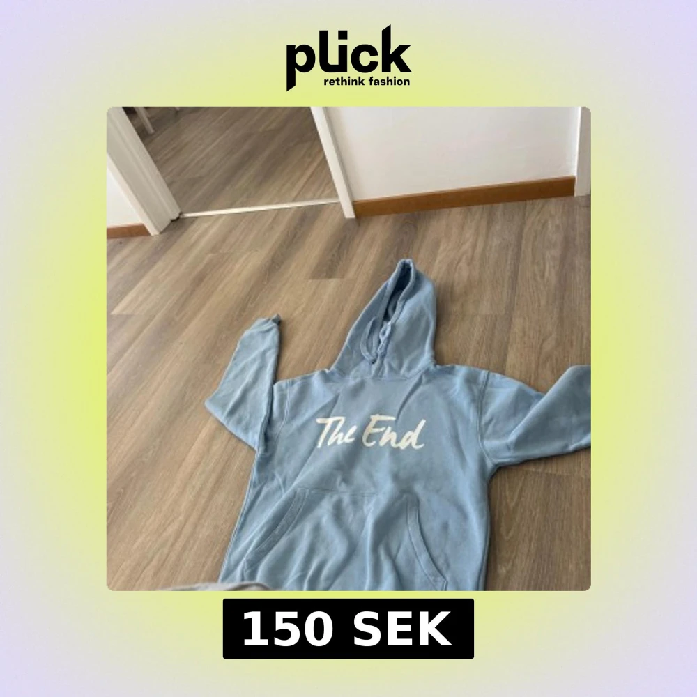 Säljer en ljusblå hoodie med vit text 'The End' på bröstet. Tröjan har huva och magficka, perfekt för en avslappnad stil. Mjuk och skön att bära.