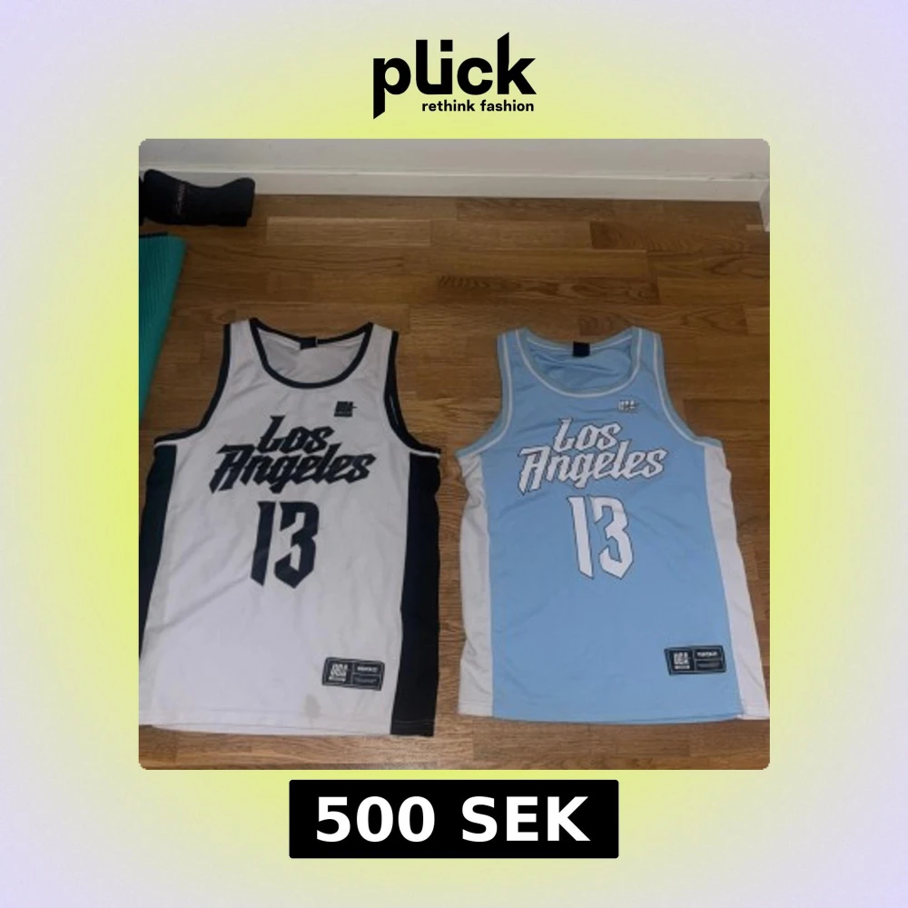 Säljer två snygga basketlinnen från FSBN i storlek XS. Ett är vitt med svarta detaljer och texten 'Los Angeles 13', det andra är ljusblått med vita detaljer och samma text. Perfekta för sportiga aktiviteter eller sommarens varma dagar.