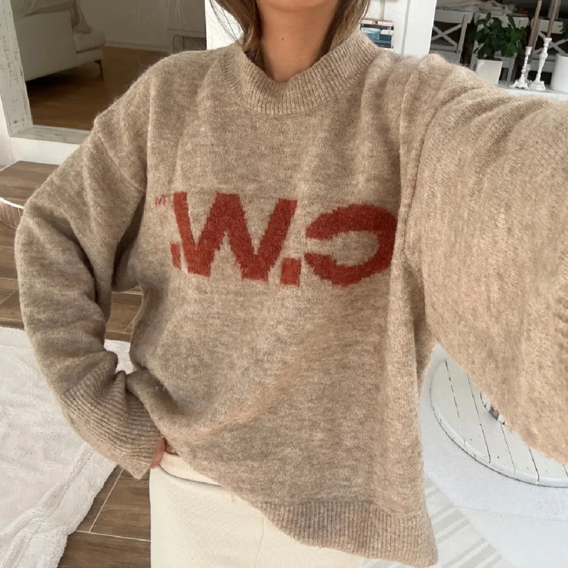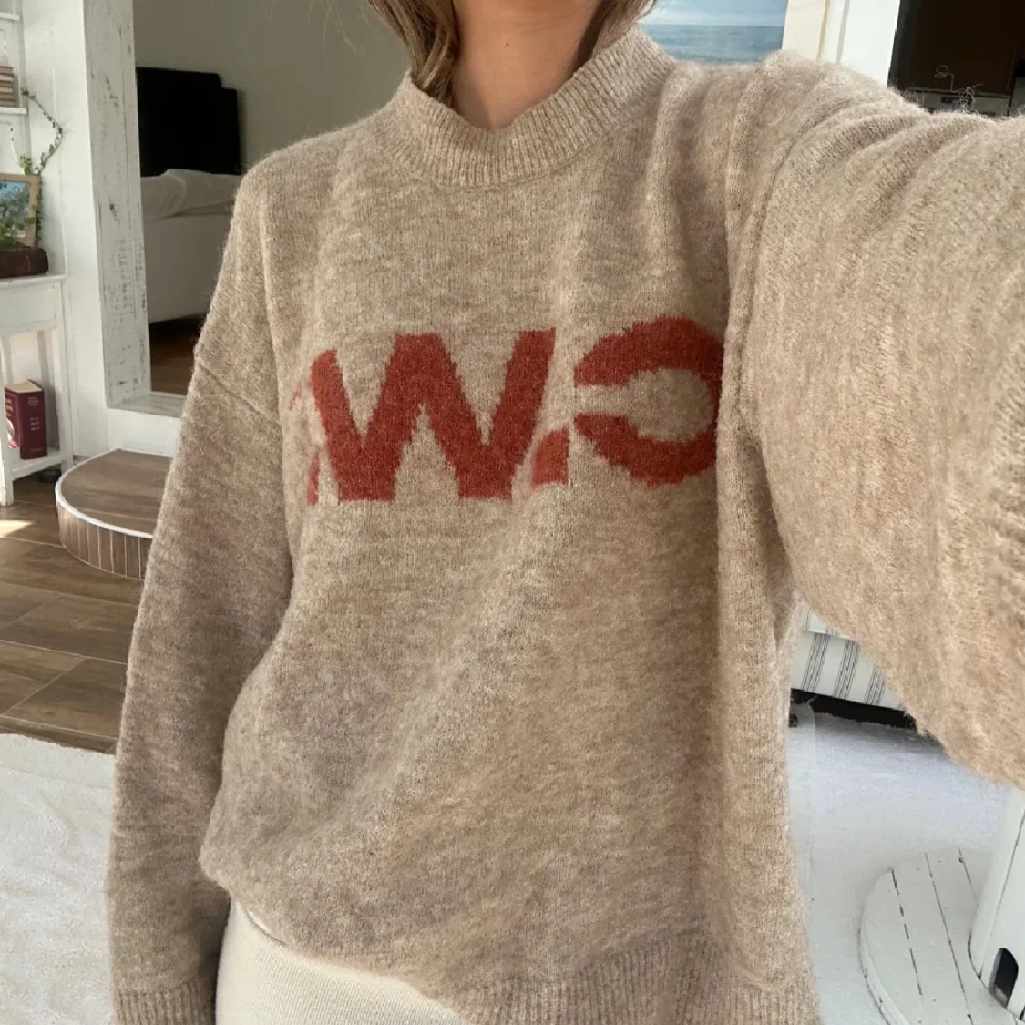 Beige stickad tröja med oversized passform och breda ribbade muddar. Framsidan har en stor röd text i grafisk stil. Tröjan har rund halsringning och långa ärmar, perfekt för lager-på-lager under kyliga dagar.