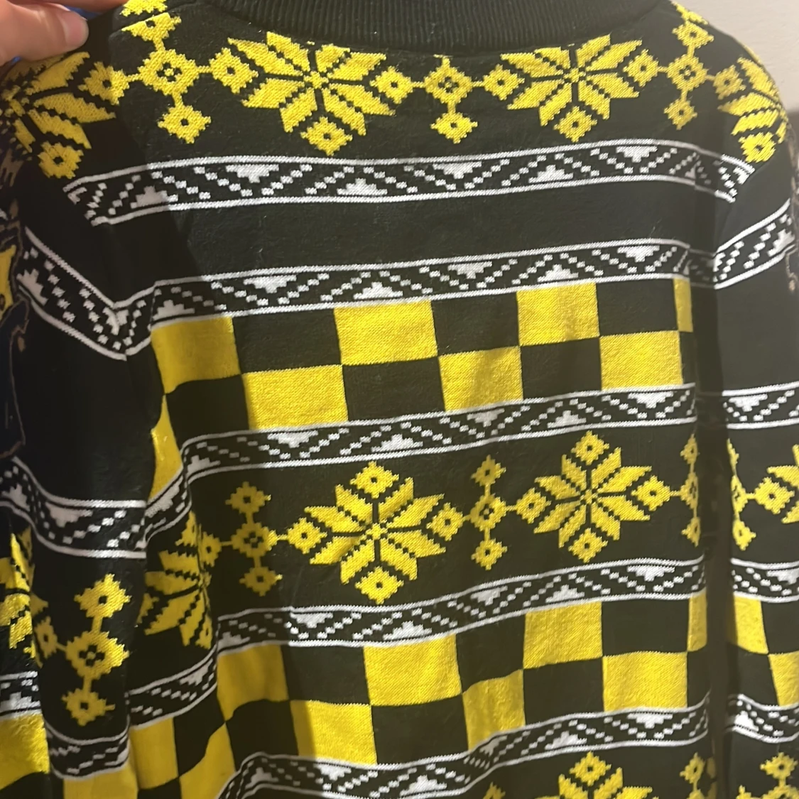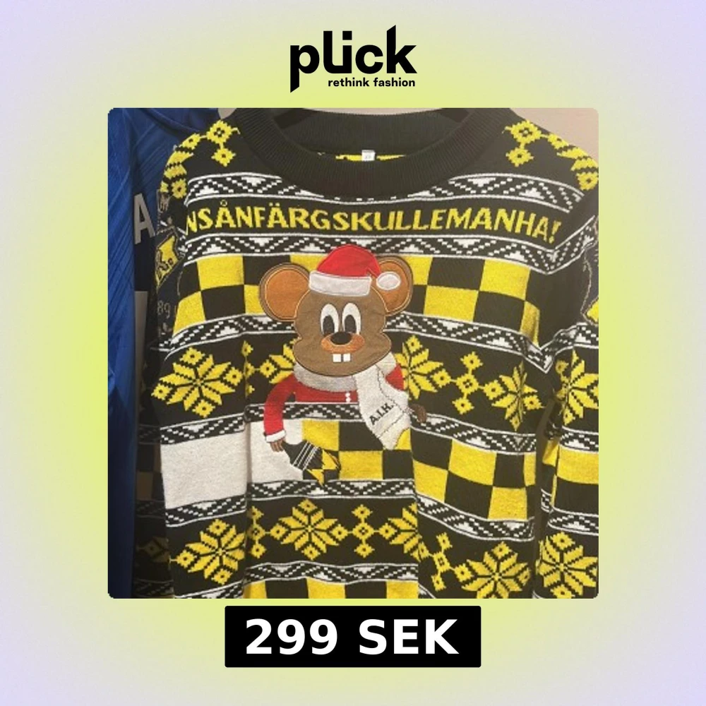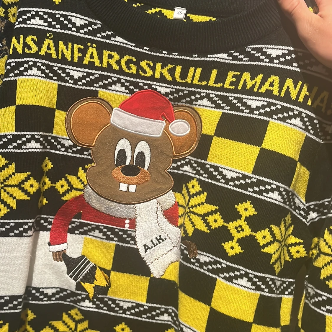 Gul och svart stickad jultröja från AIK i storlek XS. Tröjan har ett stort broderat musmotiv med tomteluva och AIK-halsduk, samt snöflingor och rutigt mönster. Perfekt för dig som vill sticka ut på julfirandet och visa AIK-stolthet. Sjukt skön å lite extra snygg inför jul😉 perfekt skick! Finns heller inte kvar att köpa.