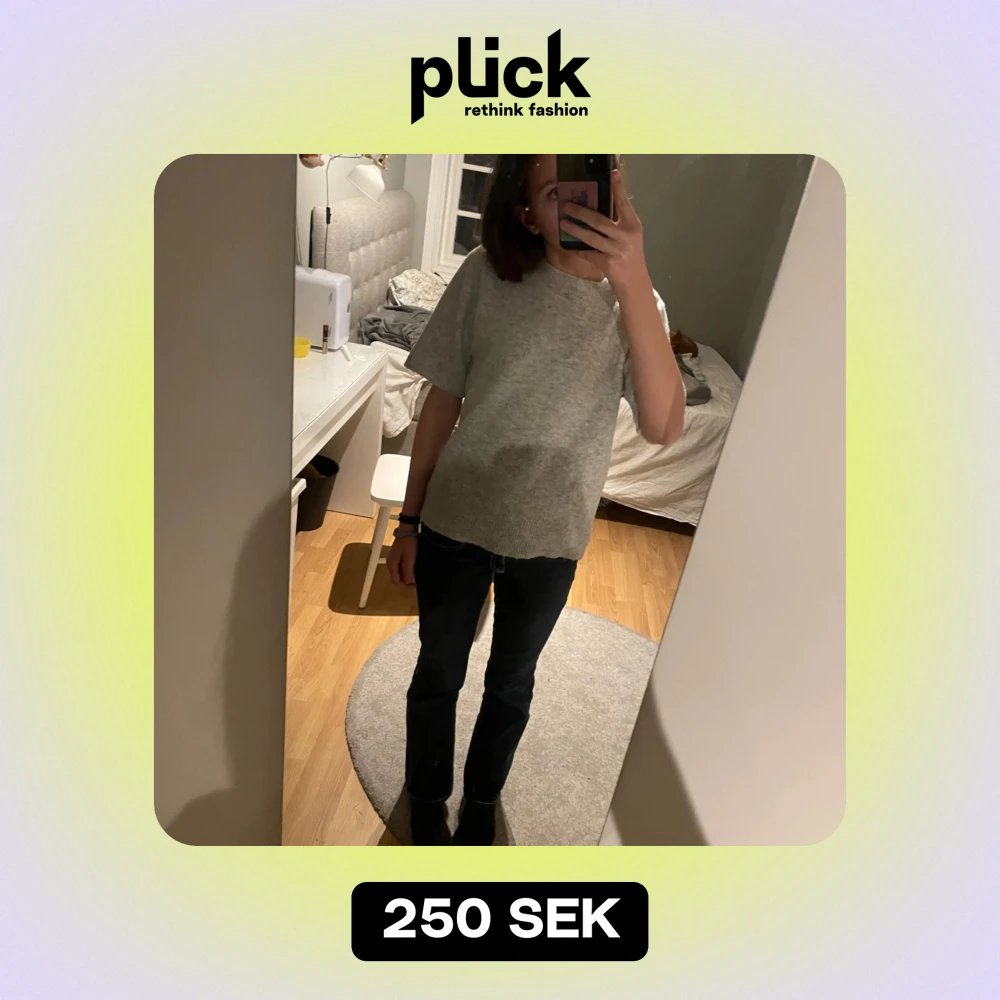 Säljer en supermysig grå stickad tröja. Perfekt för kyliga dagar med sin mjuka och bekväma passform. Tröjan har korta ärmar och en klassisk rund halsringning. Passar både till vardags och lite finare tillfällen. Passar både xs och s🩶