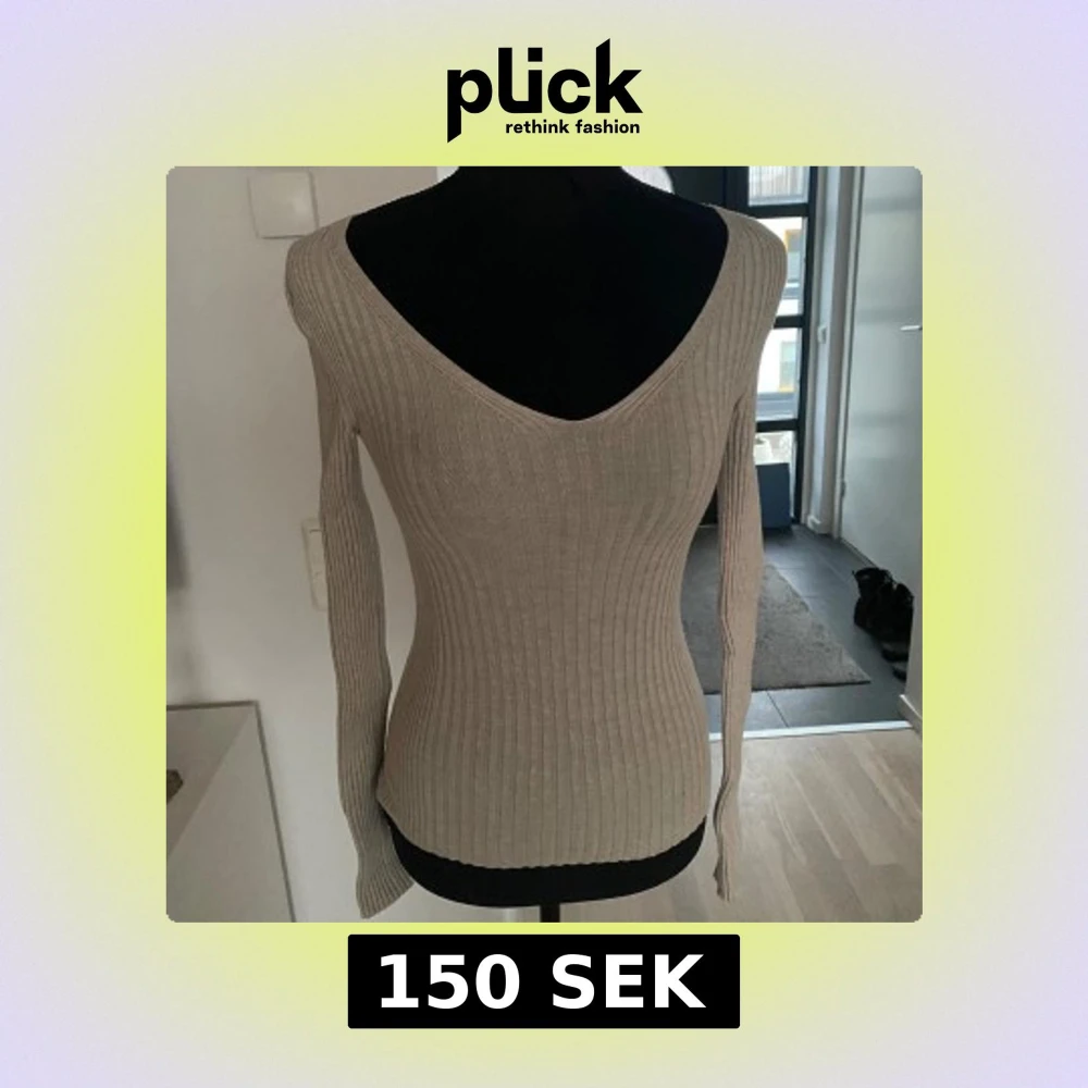 Snygg beige ribbad tröja med v-ringad hals och långärmade ärmar. Perfekt för en stilren look.