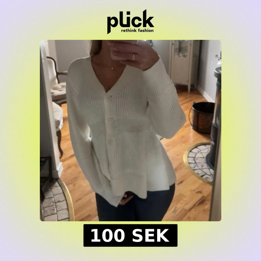 Superfin vit stickad kofta med v-ringning och stora knappar framtill. Modellen har långa ärmar och en lite lösare passform som ger en chill och snygg look. Perfekt att slänga på sig över ett linne eller t-shirt.