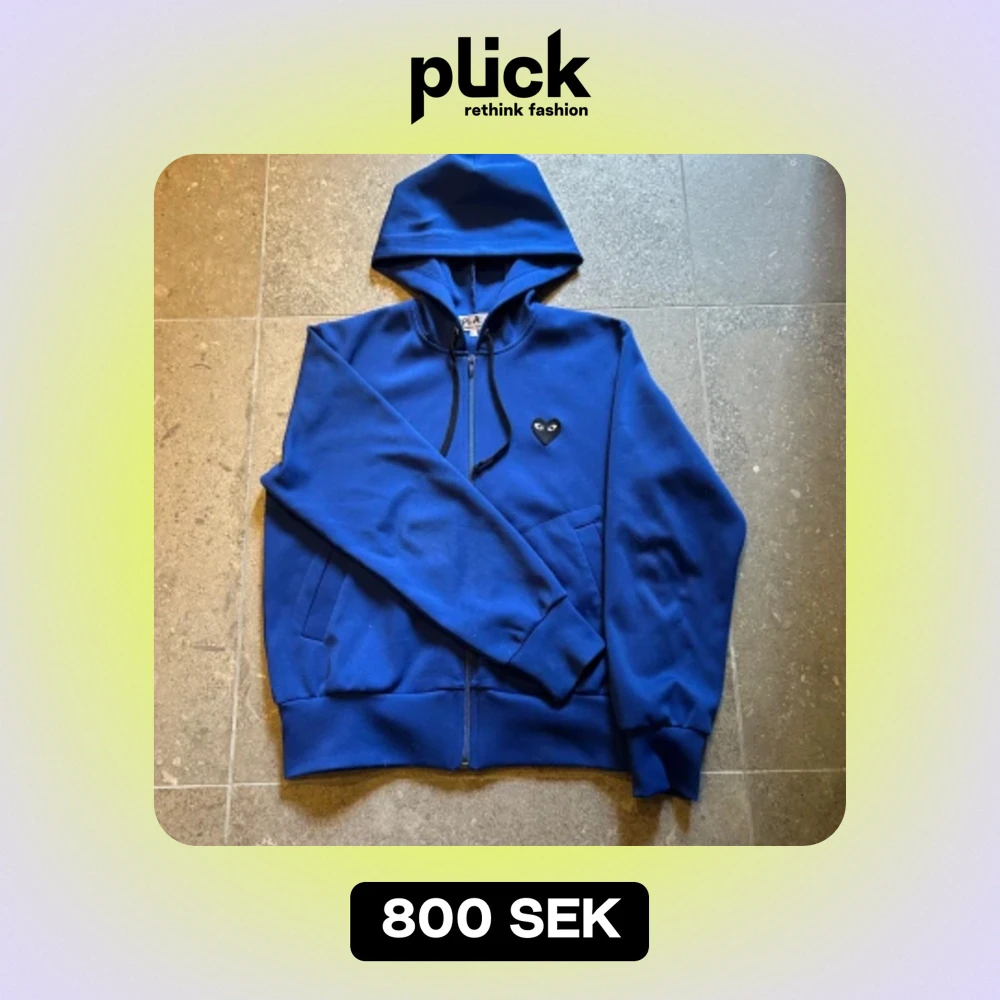 Säljer en snygg blå cdg hoodie med dragkedja och huva. Den har en svart hjärtdetalj med ögon på bröstet och en större på ryggen. Perfekt för vardagsbruk eller chill dagar. Den är i bra skick och väldigt bekväm.