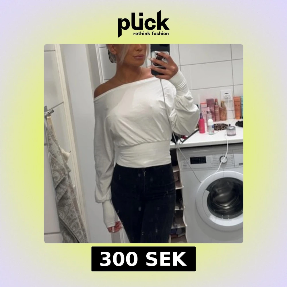 Säljer en vit långärmad tröja med offshoulder-design och bred midjeresår. Tröjan har en loose passform upptill och sitter tajt runt midjan, vilket ger en snygg siluett. Materialet känns mjukt och stretchigt, perfekt för dig som gillar trendiga och bekväma plagg.