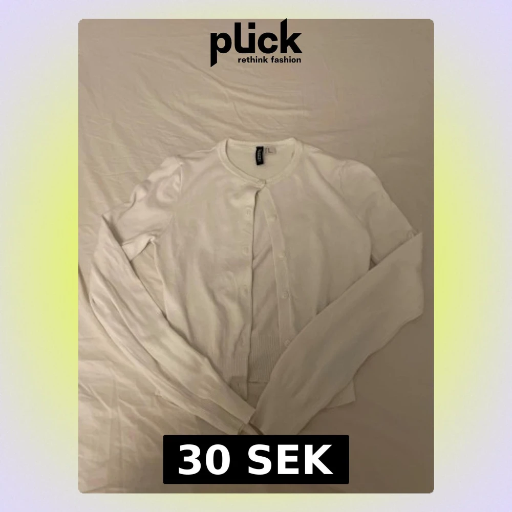 Vit, klassisk kofta i storlek XS. Den har rund hals, långa ärmar och knappar framtill. Materialet är mjukt och känns som bomull, med ribbade muddar vid ärmslut och nederkant. Perfekt att slänga över en topp för en chill look.