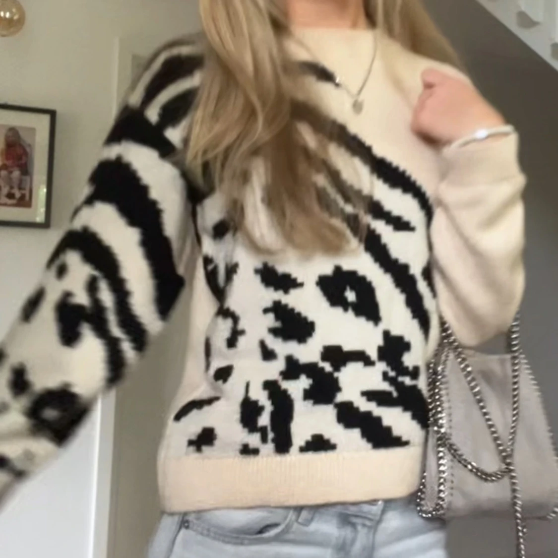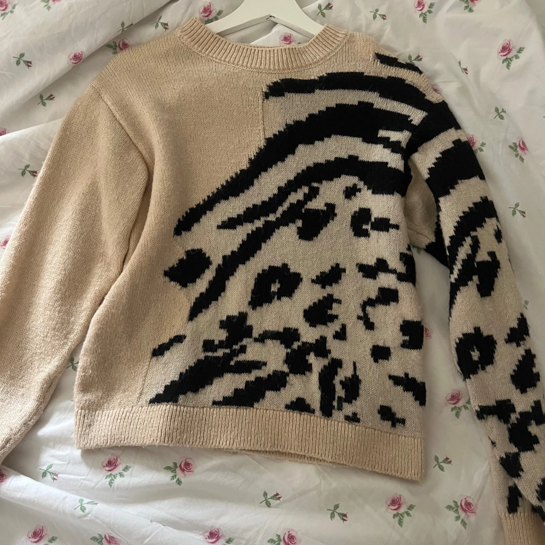 Säljer en snygg beige tröja med svart zebramönster. Tröjan har en rund hals och långa ärmar, perfekt för en trendig look. Passar bra till jeans eller kjol.