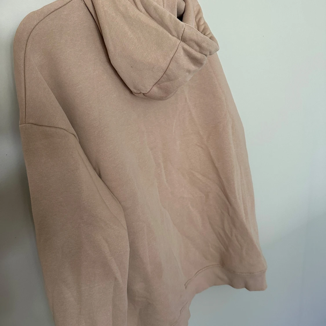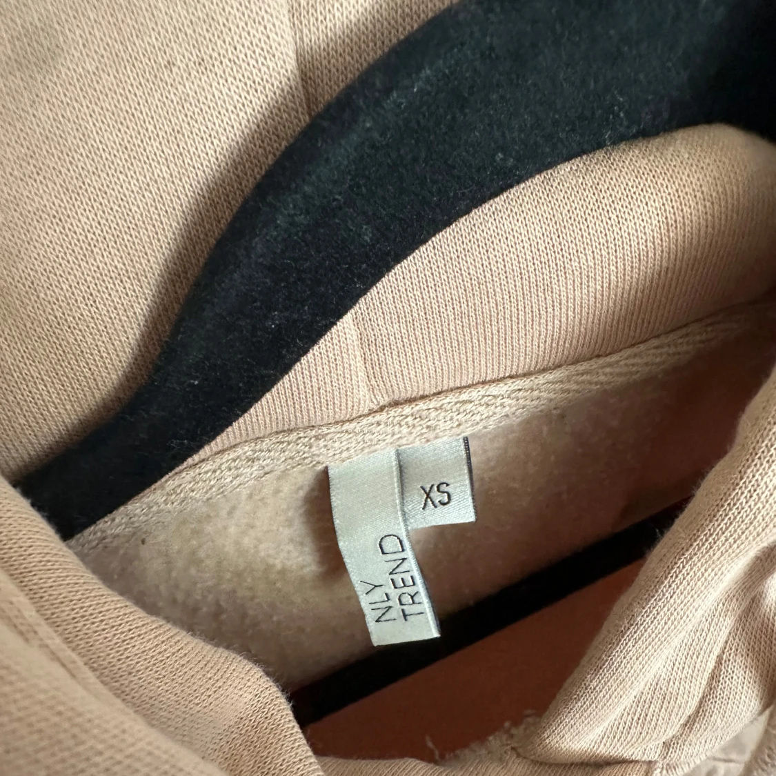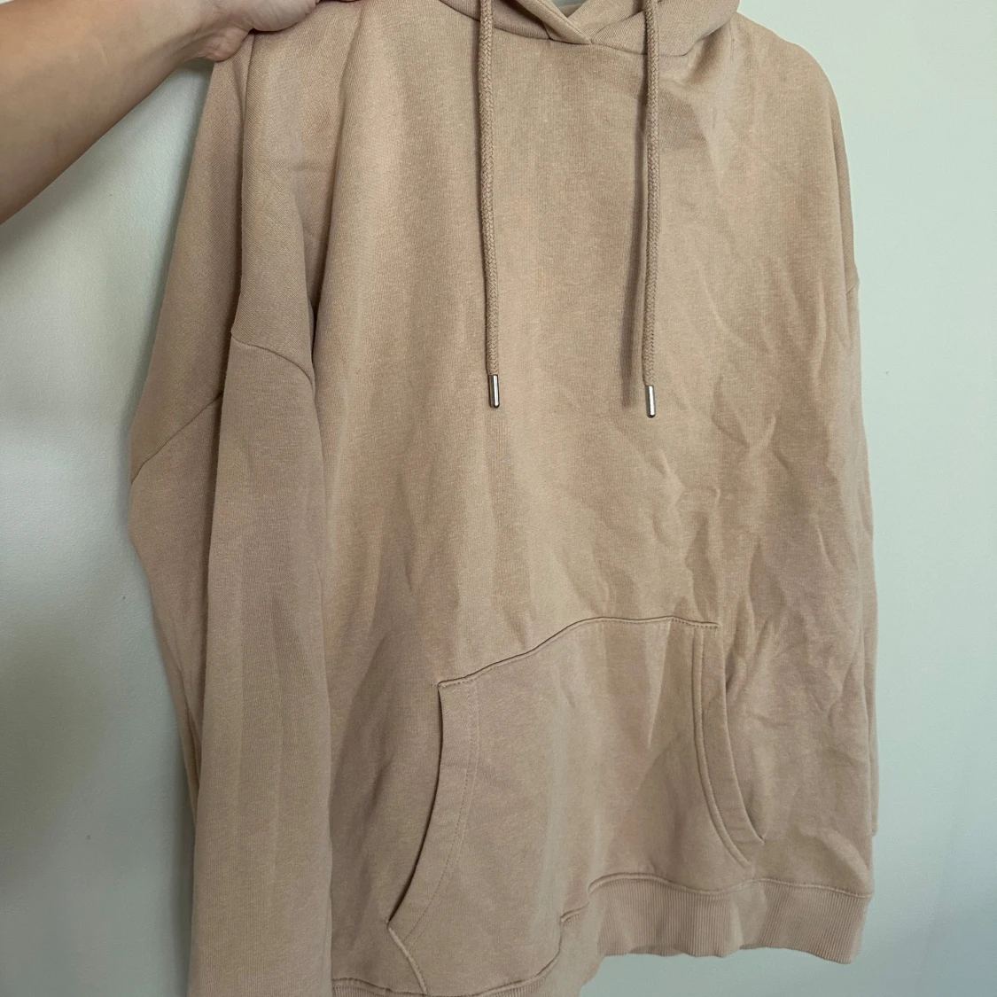 Säljer en beige hoodie från NLY Trend i storlek XS. Tröjan har huva med snörning, magficka och långa ärmar. Perfekt för en chill och avslappnad stil. Materialet är mjukt och skönt, troligtvis bomullsmix. Oversized
