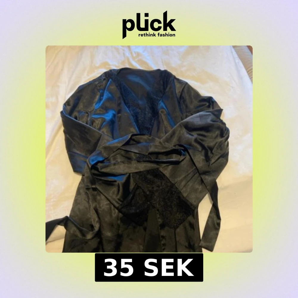 Snygg svart omlottjacka i glansigt satinmaterial med breda ärmar och knytband i midjan. Morgonrocken har en elegant känsla och spetsdetaljer längs kanten som ger en extra touch. Perfekt för dig som vill ha något stilrent och trendigt.