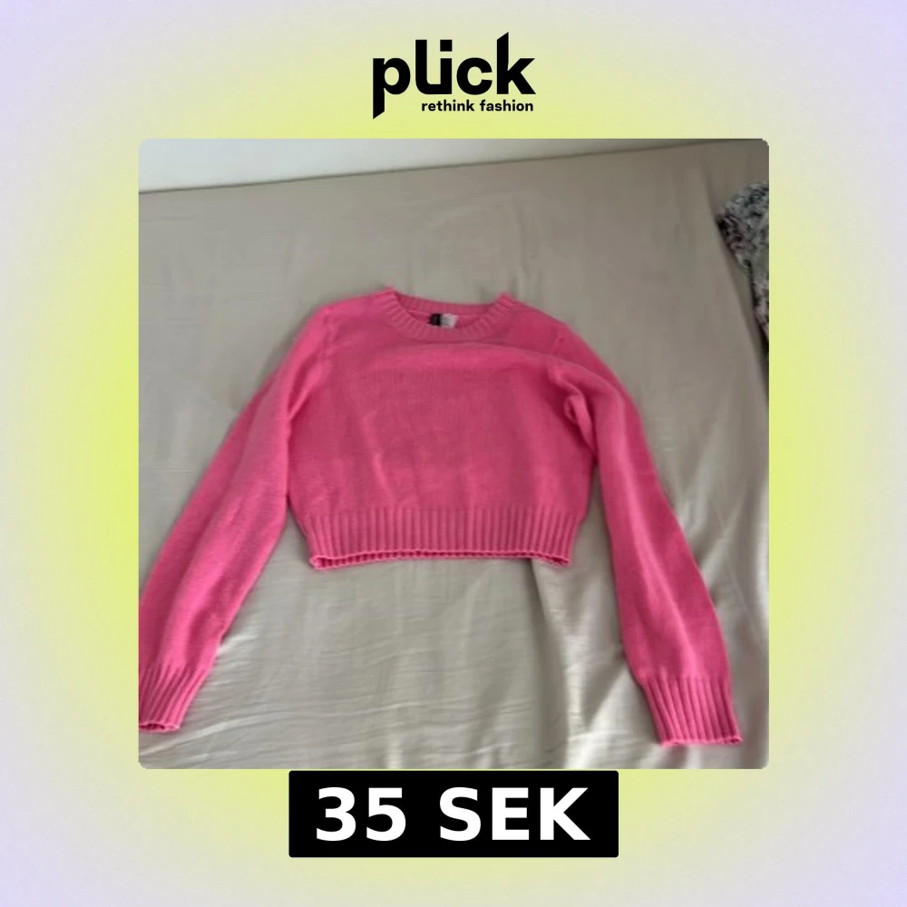 Säljer en croppad stickad tröja från H&M Divided i en snygg rosa färg. Tröjan har långa ärmar, ribbad kant vid hals, ärmslut och nederkant. Perfekt för dig som gillar färg och vill ha en trendig look.