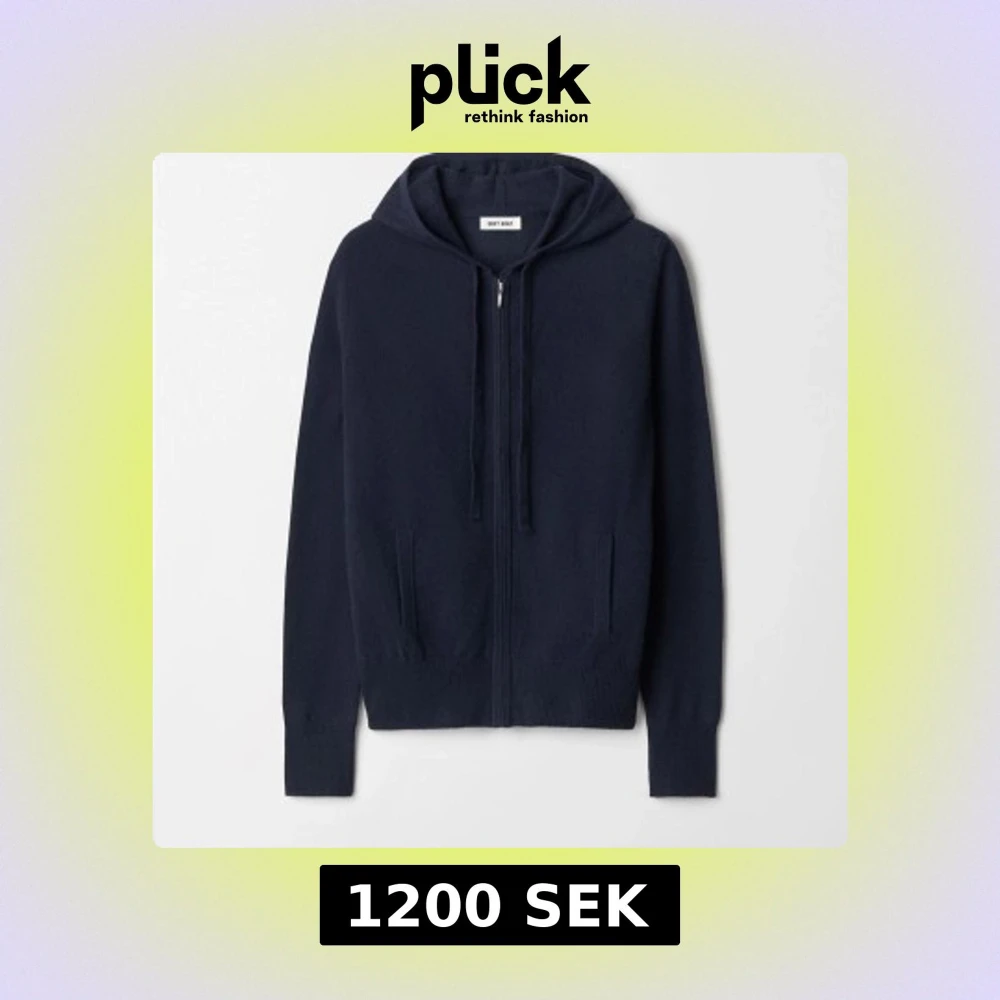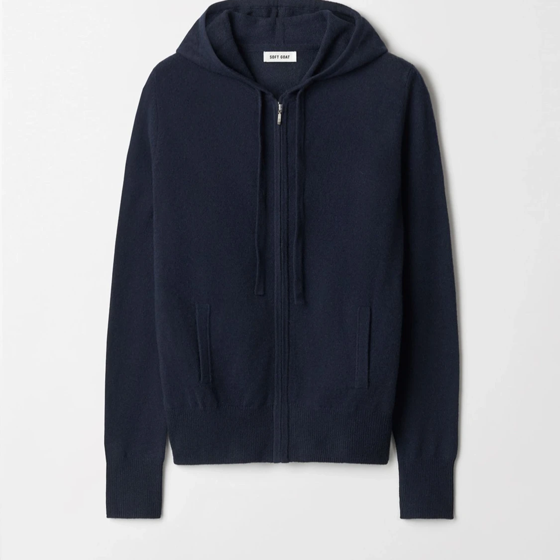 Snygg mörkblå hoodie från Soft Goat i lyxig kashmir. Tröjan har dragkedja framtill, huva med snörning och långa ärmar. Perfekt för dig som gillar en stilren och bekväm look med premiumkänsla.