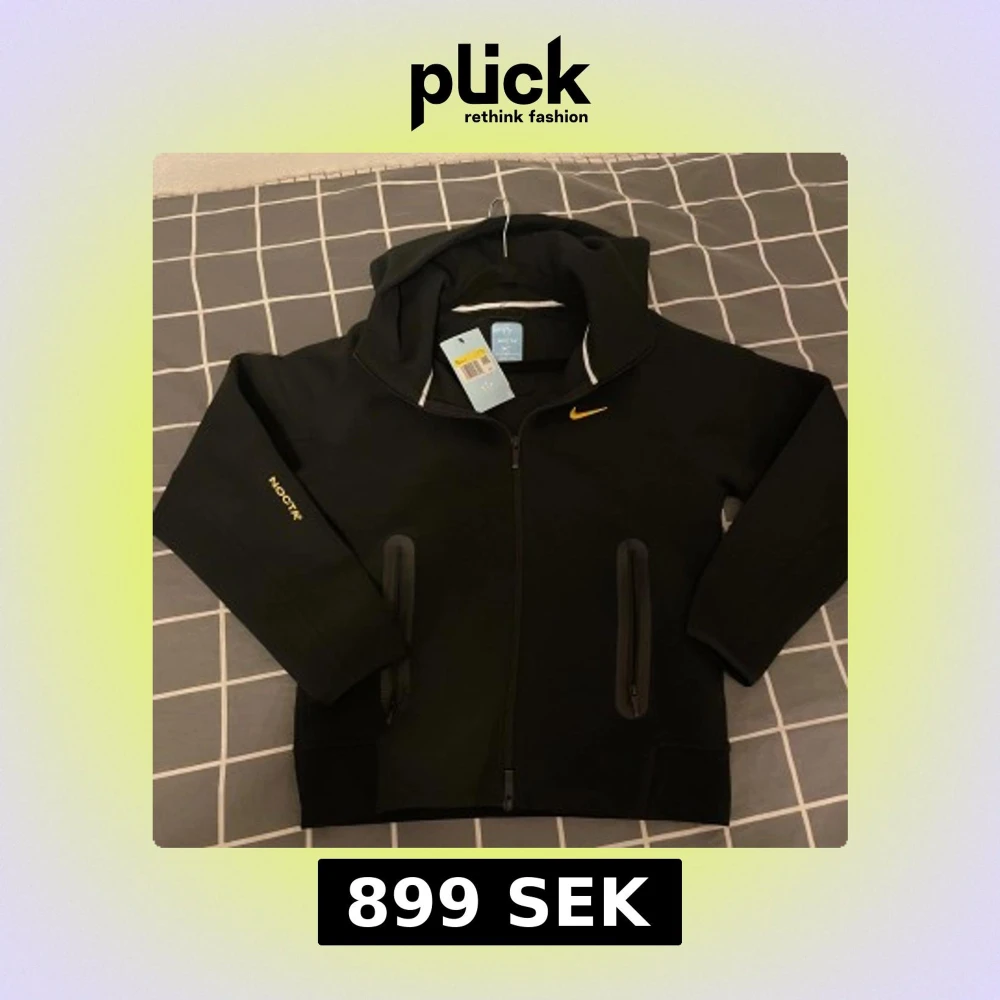 Svart hoodiejacka från Nike NOCTA med gul logga på bröstet och NOCTA-tryck på ärmen. Jackan har dragkedja framtill, två fickor med dragkedja och en sportig vibe. Perfekt för dig som gillar streetwear och snygga detaljer.