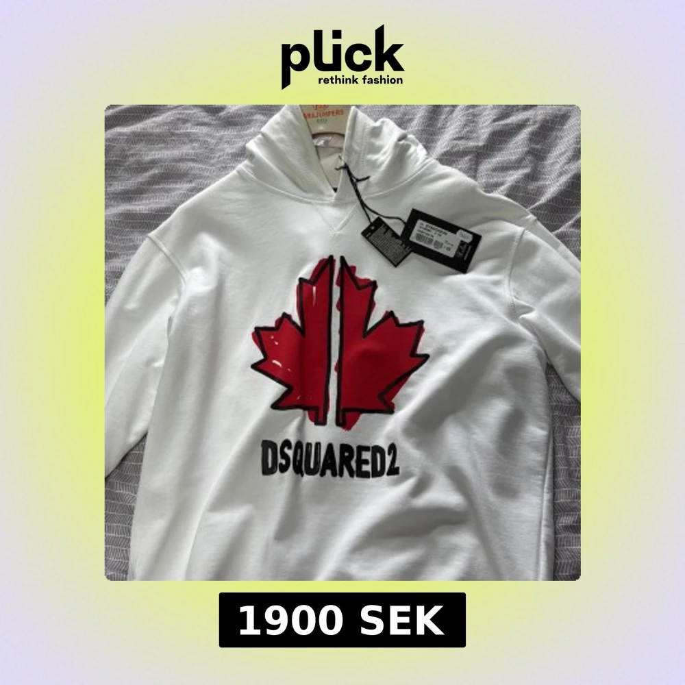 Säljer en vit hoodie från Dsquared2 med stor röd lönnlövslogga och svart text på bröstet. Tröjan har huva, långa ärmar och är gjord i mjuk bomull. Perfekt statement-plagg för dig som gillar streetwear och snygga loggor.