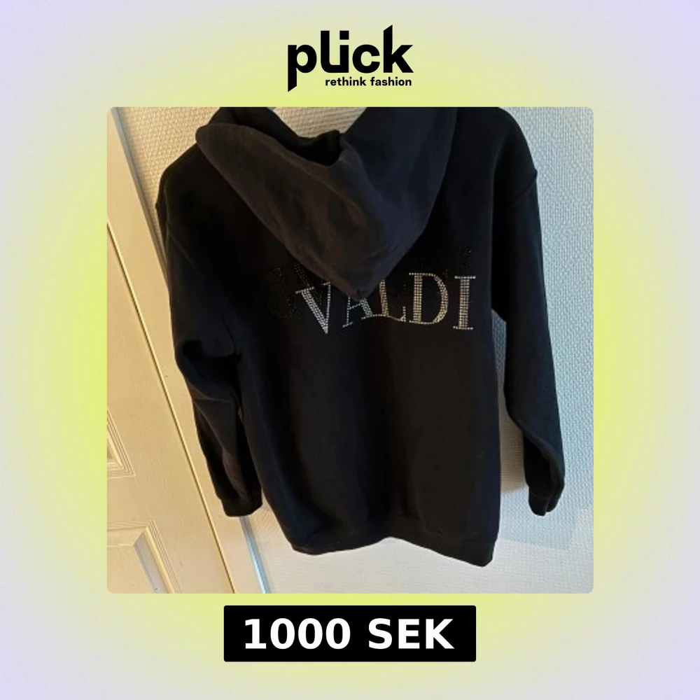 Svart supersnygg och trendig hoodie från Bvaldi med glittrande strasstenar som bildar loggan på bröstet och ryggen. Tröjan har huva, dragkedja framtill och två fickor. Perfekt för dig som gillar en stilren men ändå lite extra look. Slutsåld. Inköpt för 1099kr säljes för 1000kr. Helt ny ej använd (endast provad). Supermjuk inuti. Storlek XS motsvarar 158-164.