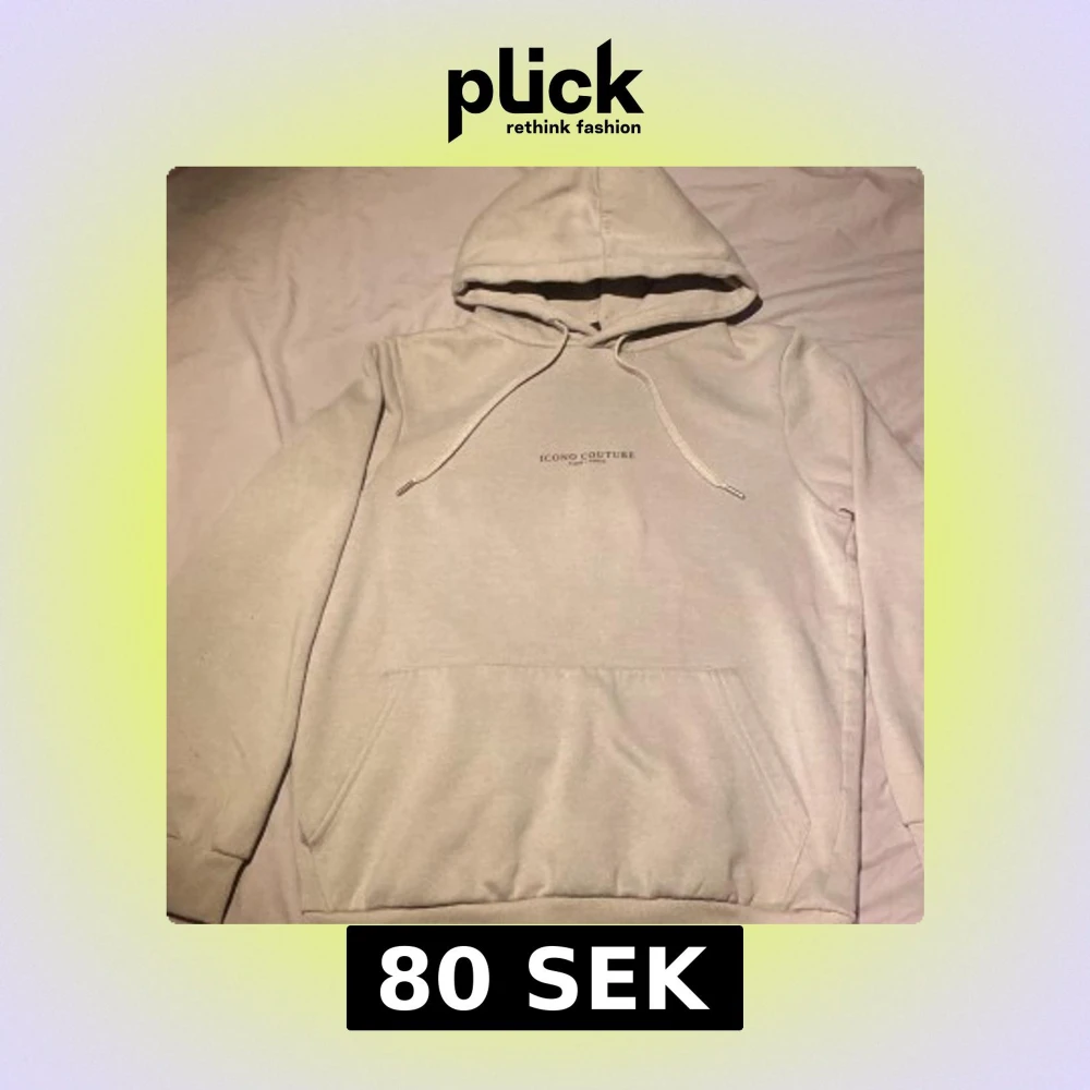 Säljer en beige hoodie från Icono Couture med diskret logga framtill och större tryck på ryggen. Tröjan har huva med dragsko och en stor magficka. Perfekt för en avslappnad och stilren look.