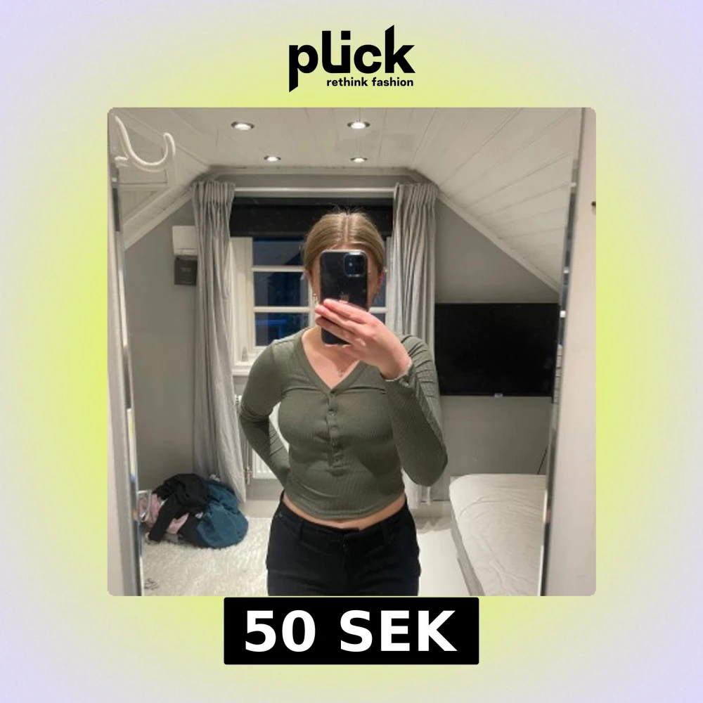 Säljer en olivgrön, croppad långärmad topp från H&M Divided. Tröjan är ribbad, har v-ringning och knappar framtill.