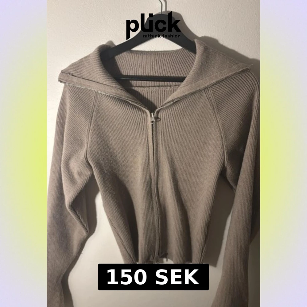 Snygg beige ribbad kofta med dragkedja framtill och bred krage. Långärmad modell med tumhål i ärmsluten för extra chill vibe. Perfekt att slänga på sig när det är lite kyligt ute. Materialet känns mjukt och stickat, vilket gör den både bekväm och stilren. Passar både XS och S