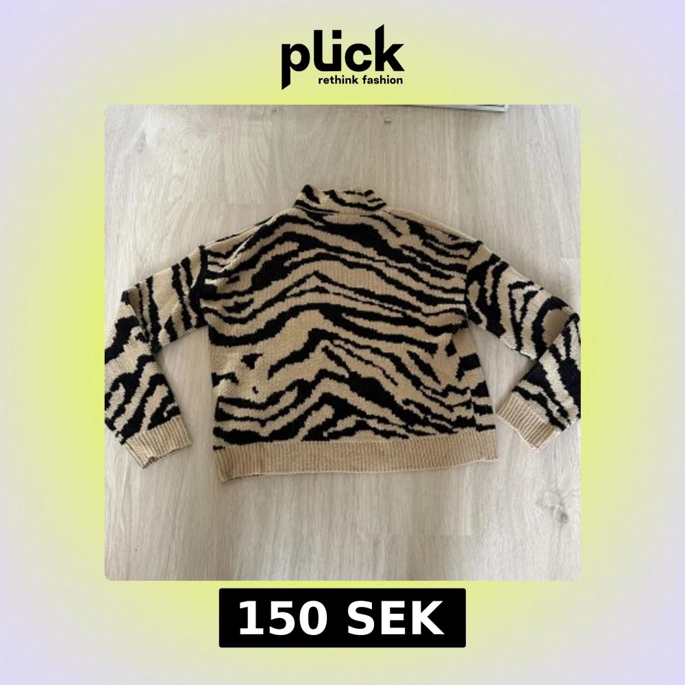 Snygg stickad polotröja med beige och svart zebramönster. Tröjan har lång ärm, ribbade muddar och hög krage.