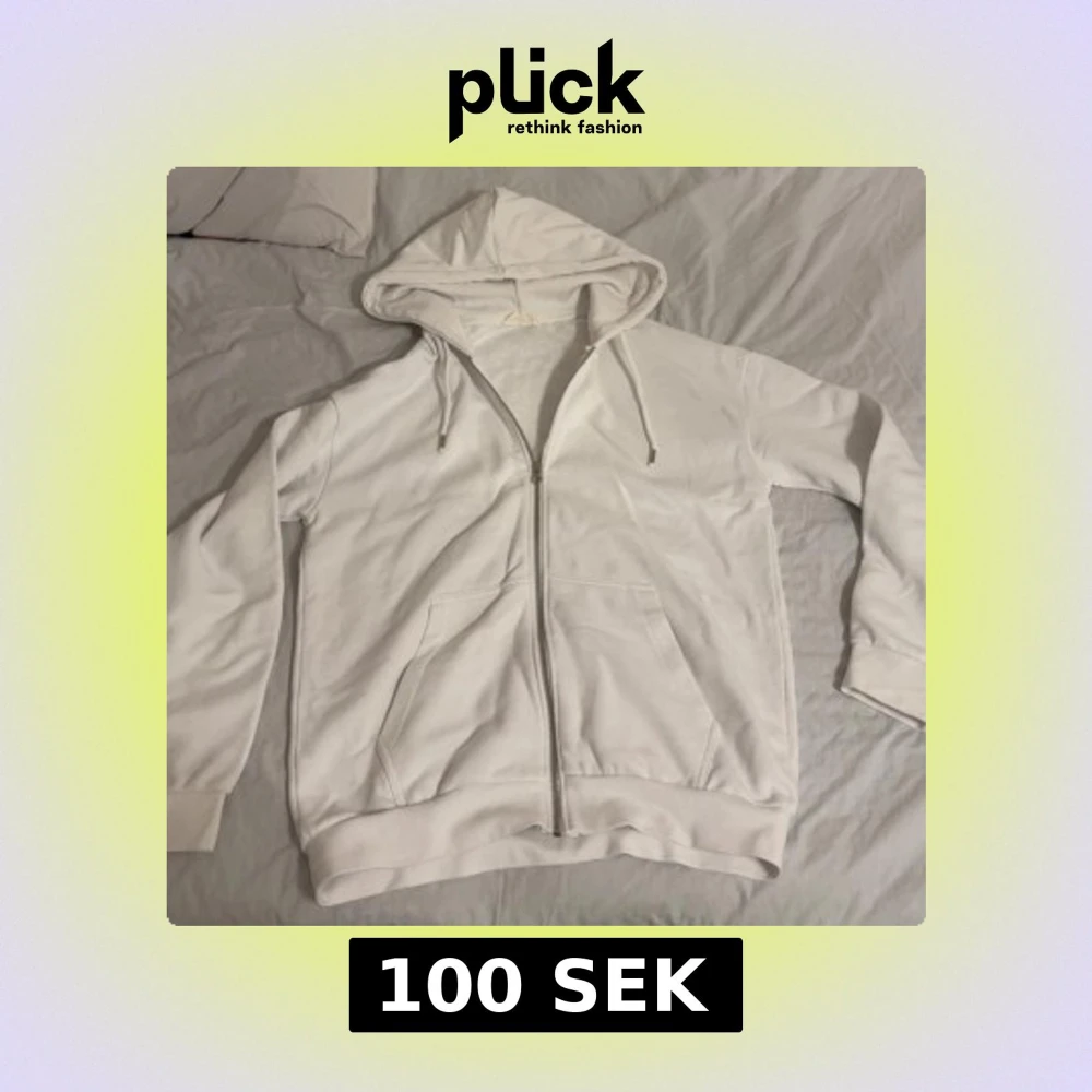 Säljer en stilren vit hoodie med dragkedja och huva. Tröjan har långa ärmar, två fickor framtill och ribbade muddar vid ärmslut och nederkant. Perfekt för en avslappnad look. Tröjan är från Pier One (aldrig använt)