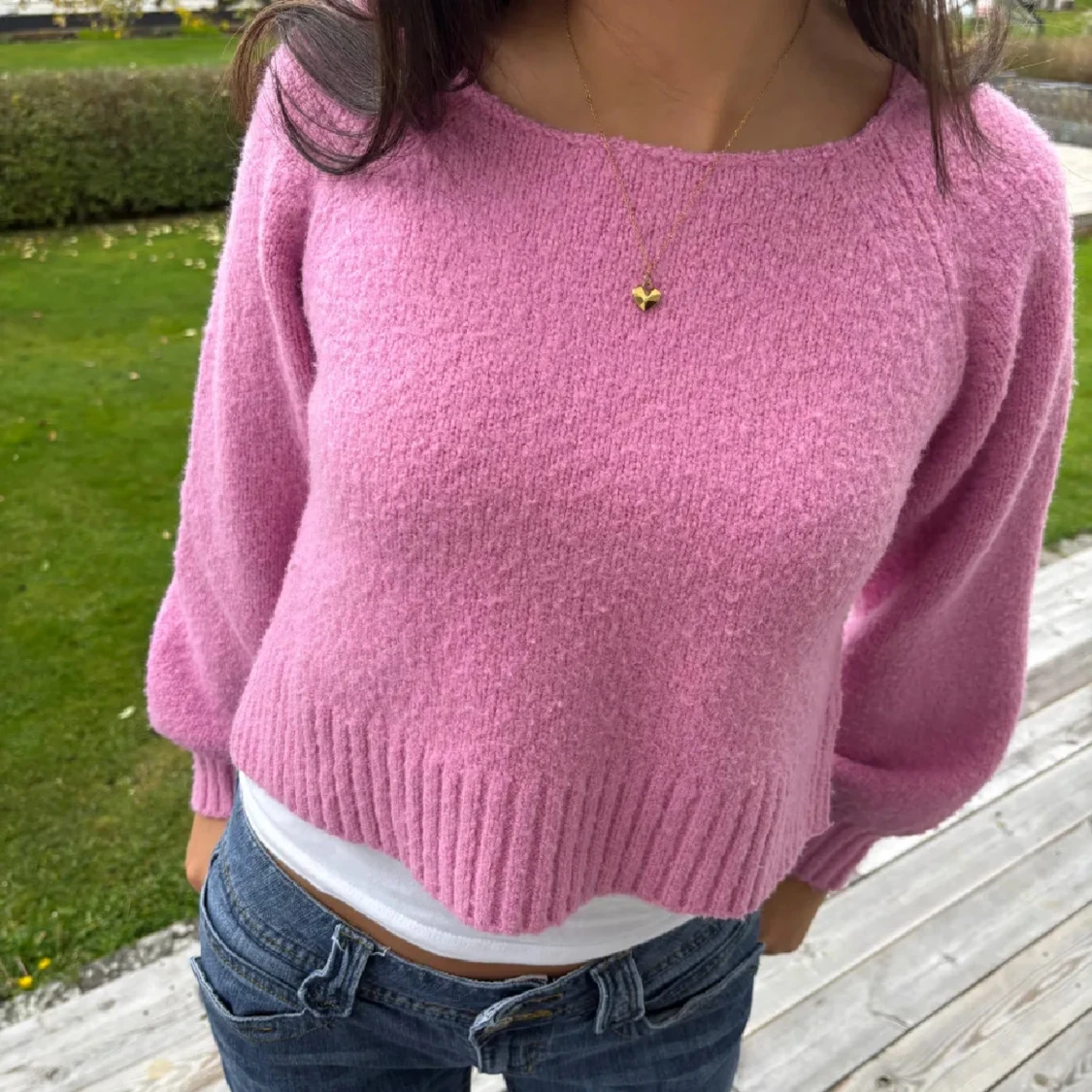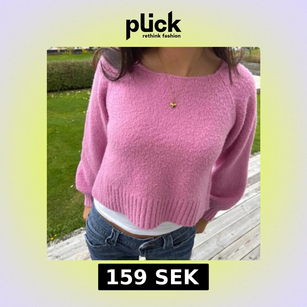 Säljer en söt rosa stickad tröja med croppad passform. Tröjan har långa ärmar och ribbade kanter som ger en stilren look. Perfekt för en avslappnad dag ute.