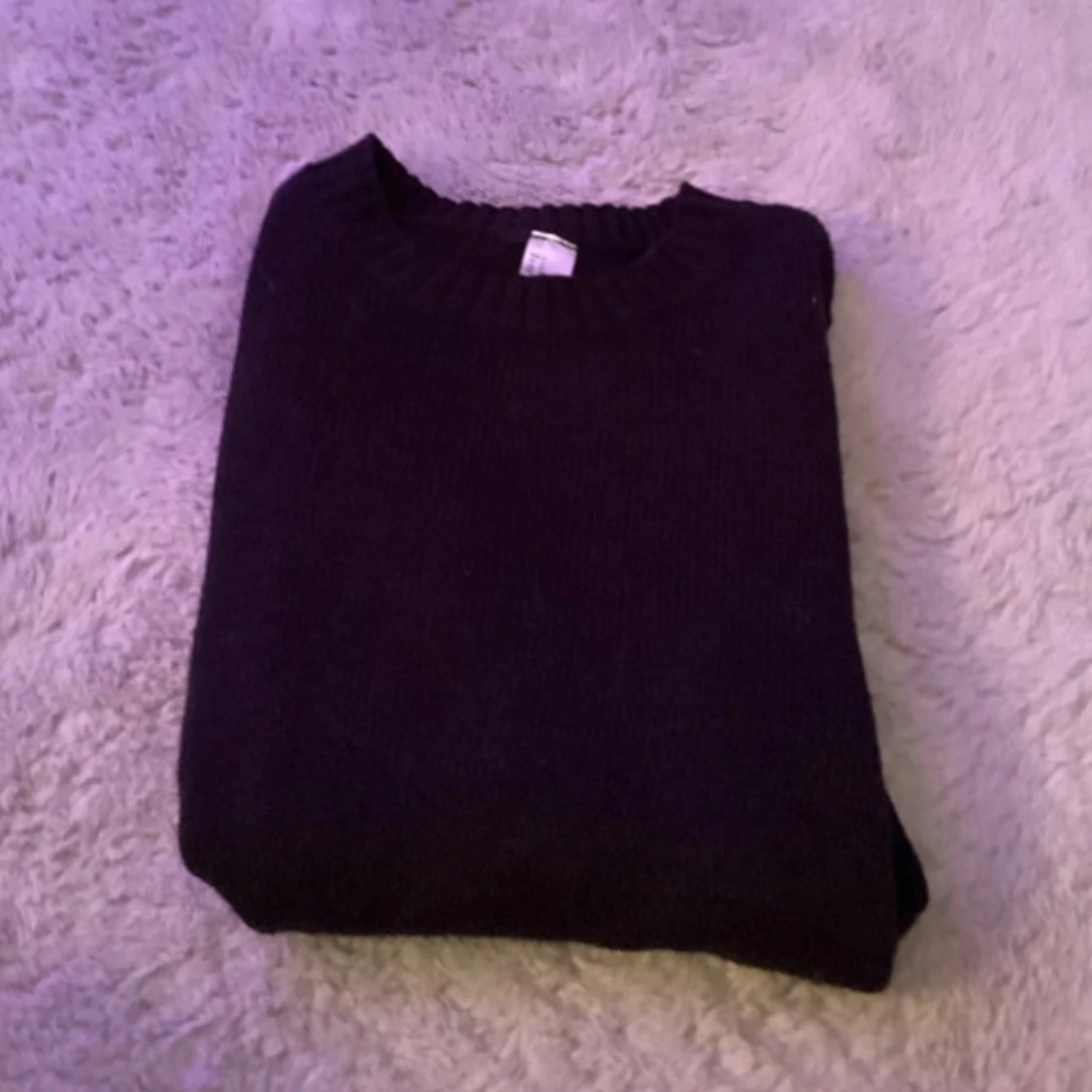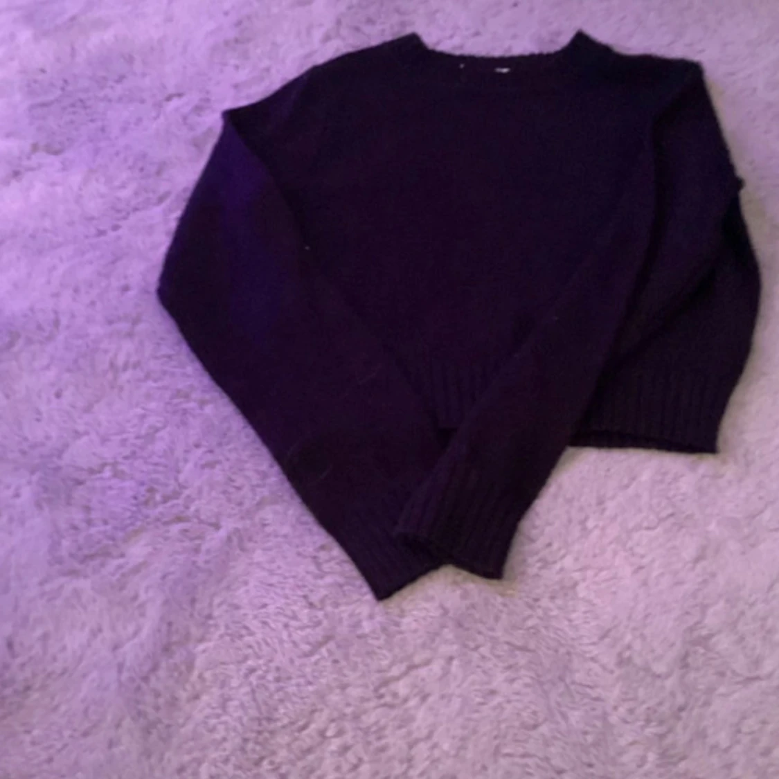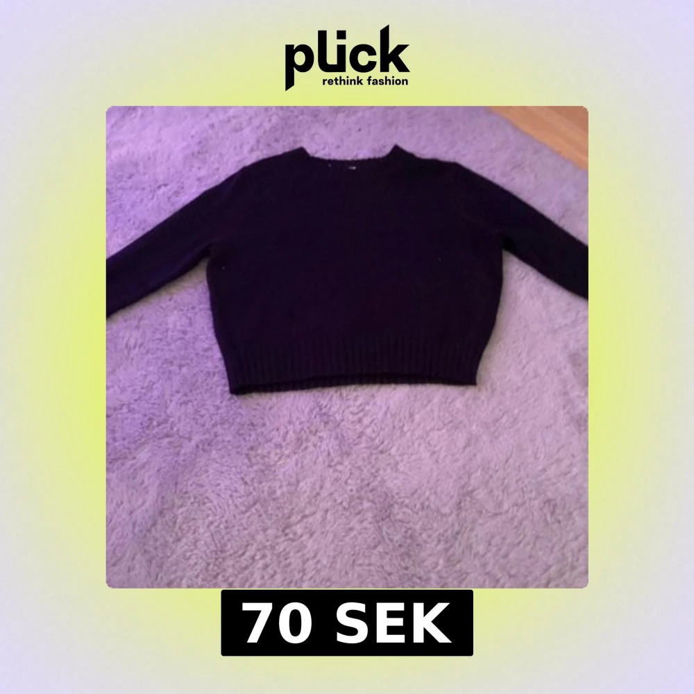 En svart, croppad stickad tröja med rund hals och långa ärmar. Tröjan har ribbade muddar vid ärmslut och nederkant, vilket ger en snygg och enkel look. Perfekt för lager-på-lager under kyliga dagar.