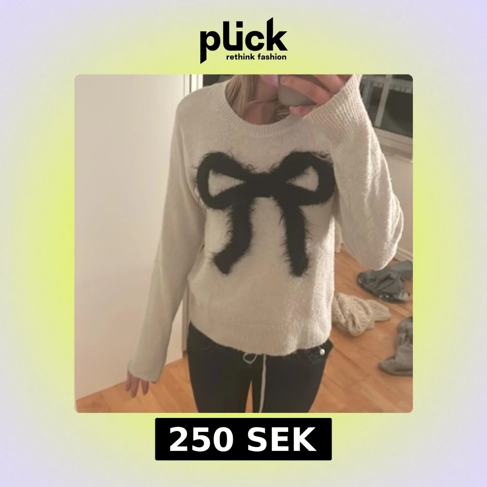 Säljer en mysig beige tröja med en stor svart rosett på framsidan. Tröjan har långa ärmar och en rund halsringning. Perfekt för en stilren och söt look.