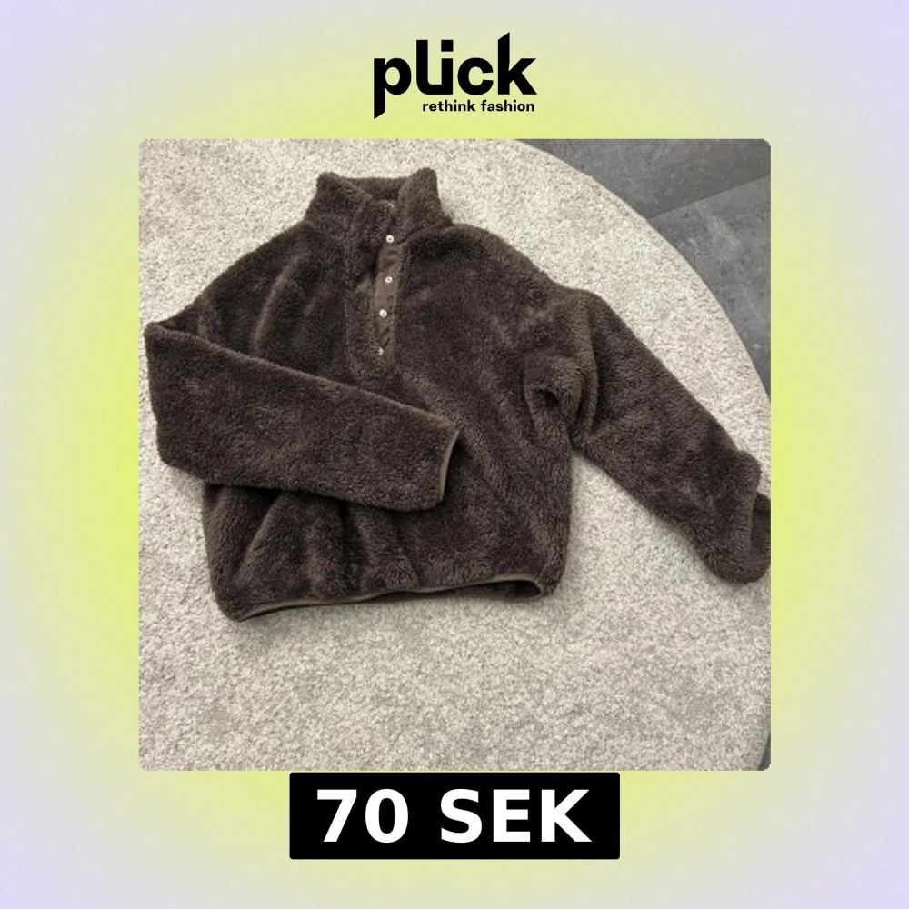 Mysig brun fleece tröja med hög krage och knappar framtill. Perfekt för kyliga dagar med sin mjuka och varma känsla. Tröjan har långa ärmar och en avslappnad passform.
