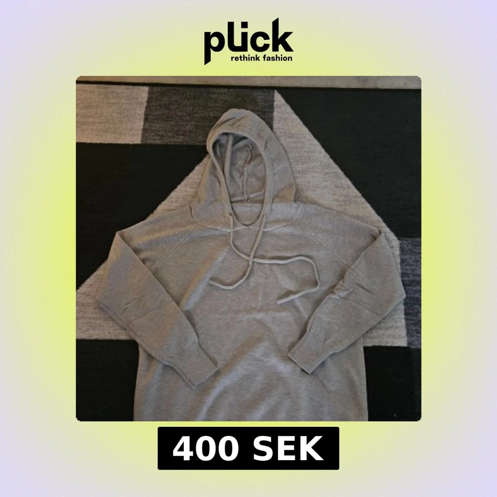 Säljer en enkel och stilren grå hoodie med snörning i huvan. Tröjan har långa ärmar och ribbade muddar vid ärmslut och nederkant. Perfekt för en avslappnad look.