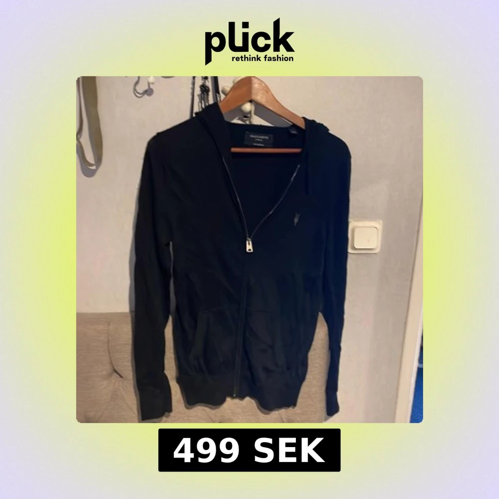 Svart hoodie från AllSaints med dragkedja framtill och broderad logga på bröstet. Tröjan har huva med snörning, två fickor och är långärmad. Tillverkad i mjuk bomull, perfekt för chill dagar eller när du vill ha en clean look.